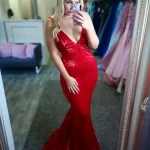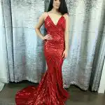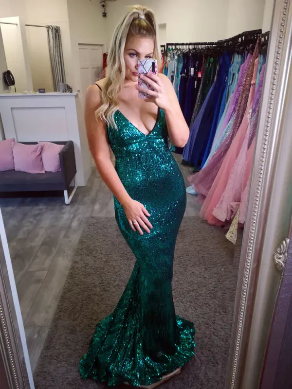Make a statement in the **Aileen Emerald Green Sequin Dress**, a showstopping mermaid-silhouette gown that hugs every curve to perfection. Crafted from head-to-toe all-over sequin fabric in a rich emerald green, this dress features a deep V-neckline and a dramatic flared skirt that sweeps the floor with effortless glamour. Perfect for your debs night, the Aileen is guaranteed to turn heads from the moment you walk through the door.