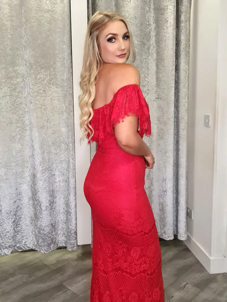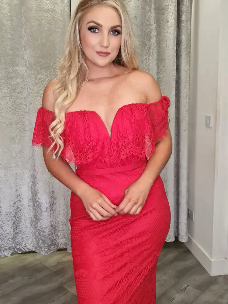 Make a bold entrance in the **Ainsley Lace Evening Gown**, a stunning red full-length dress crafted from intricate all-over lace with a beautifully fitted silhouette that skims every curve. Featuring a romantic off-the-shoulder neckline with a delicate lace frill and a daring sweetheart plunge, this gown effortlessly blends elegance with confidence. A showstopping choice for your debs night, now available at a special sale price at Obsession Showroom.