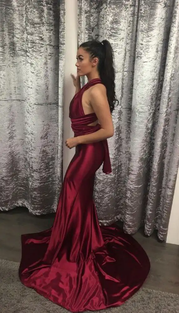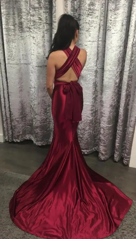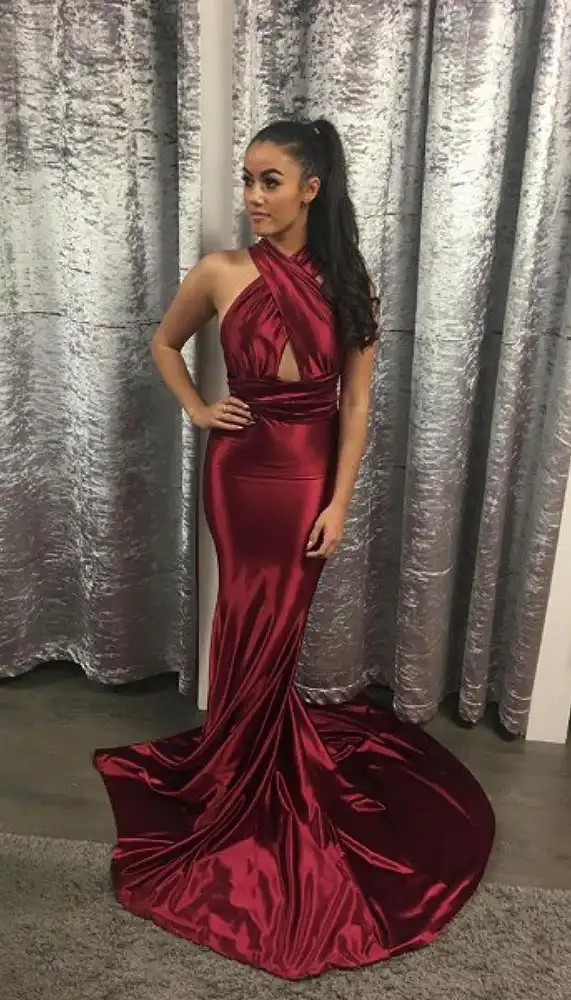 Make a stunning entrance in the Alianna Multiway, a show-stopping burgundy mermaid gown crafted from luxurious stretch satin that hugs every curve to perfection. Featuring a elegant crossover halter neckline with a daring keyhole cutout, this dress flows effortlessly into a dramatic sweeping train that commands attention from every angle. A true debs showstopper, the Alianna is the ultimate choice for the girl who wants to look and feel unforgettable on her big night.