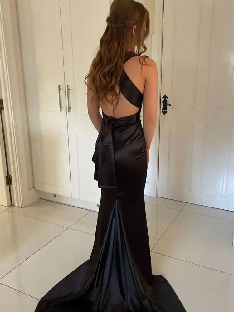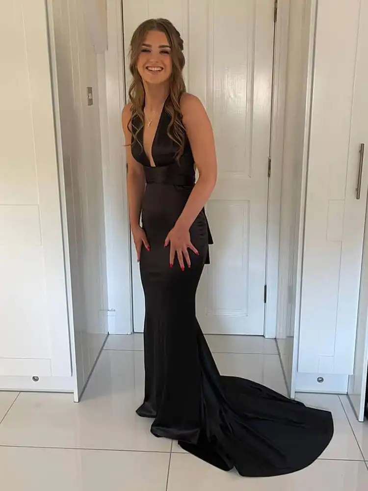 Make a stunning entrance in the Alianna Multiway, a sleek black satin gown that combines timeless elegance with a modern edge. Featuring a daring deep V halterneck, a figure-hugging mermaid silhouette, and a dramatic floor-sweeping train, this dress is designed to turn heads from every angle. Perfect for your debs night, this showstopping gown is available exclusively at Obsession Showroom in Carlow.