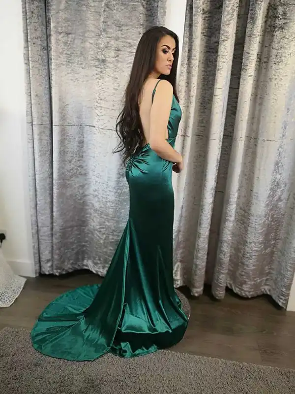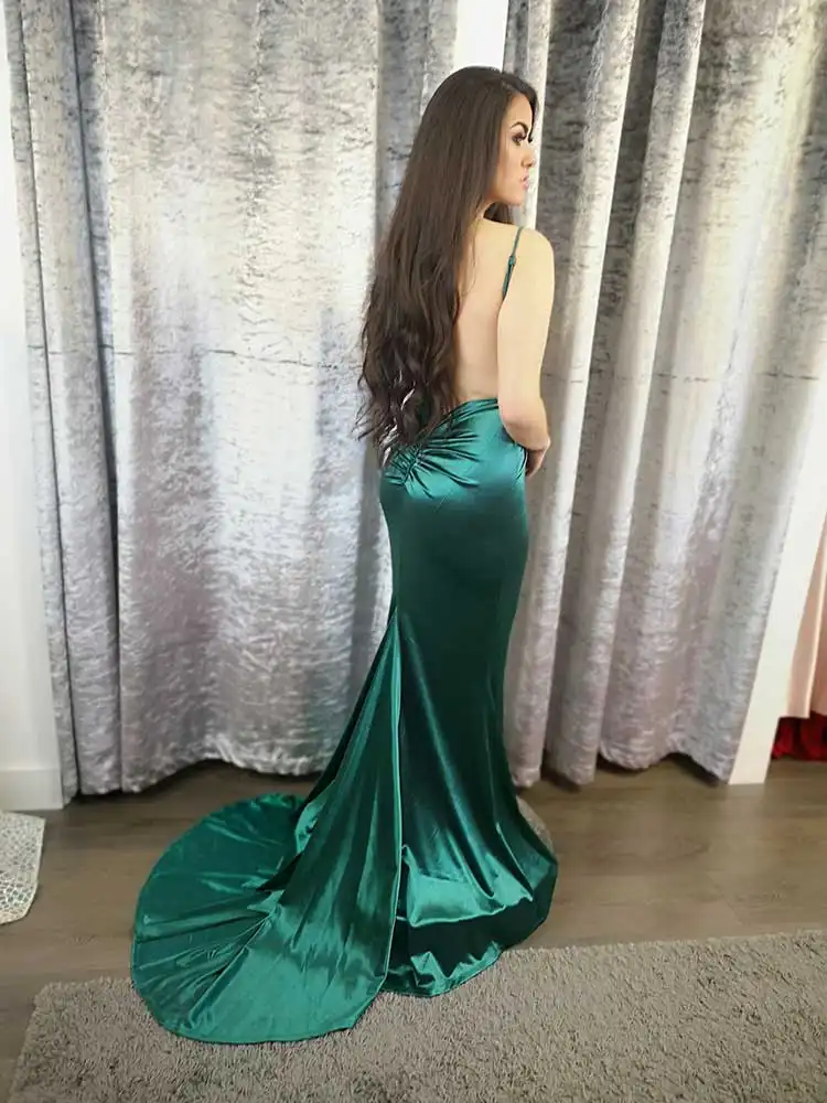 Make a statement this debs season in the **Allie Emerald Green Backless Dress**, a show-stopping mermaid silhouette crafted from luxurious satin-finish stretch fabric that skims every curve beautifully. Featuring delicate spaghetti straps, a flattering deep V-neckline, and an elegant sweeping train, this gown exudes effortless glamour from every angle. The rich emerald hue and sleek, minimalist design make it an unforgettable choice for your debs night or any formal occasion where you want to truly turn heads.