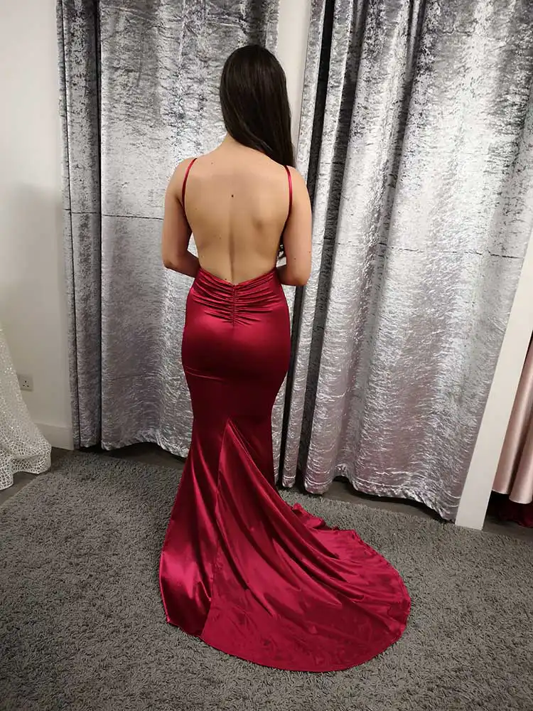 Make a stunning entrance in the Allie Wine Backless Dress, a sleek mermaid-style gown crafted from luxurious stretch satin in a rich, deep wine hue. Featuring a plunging V-neckline, delicate spaghetti straps, and a dramatic open back, this figure-hugging silhouette flows effortlessly into an elegant train. Perfect for your debs night, this show-stopping dress is the ultimate choice for the girl who wants to turn heads from every angle.