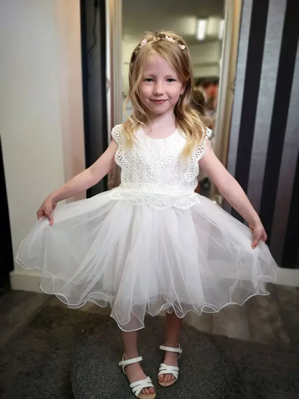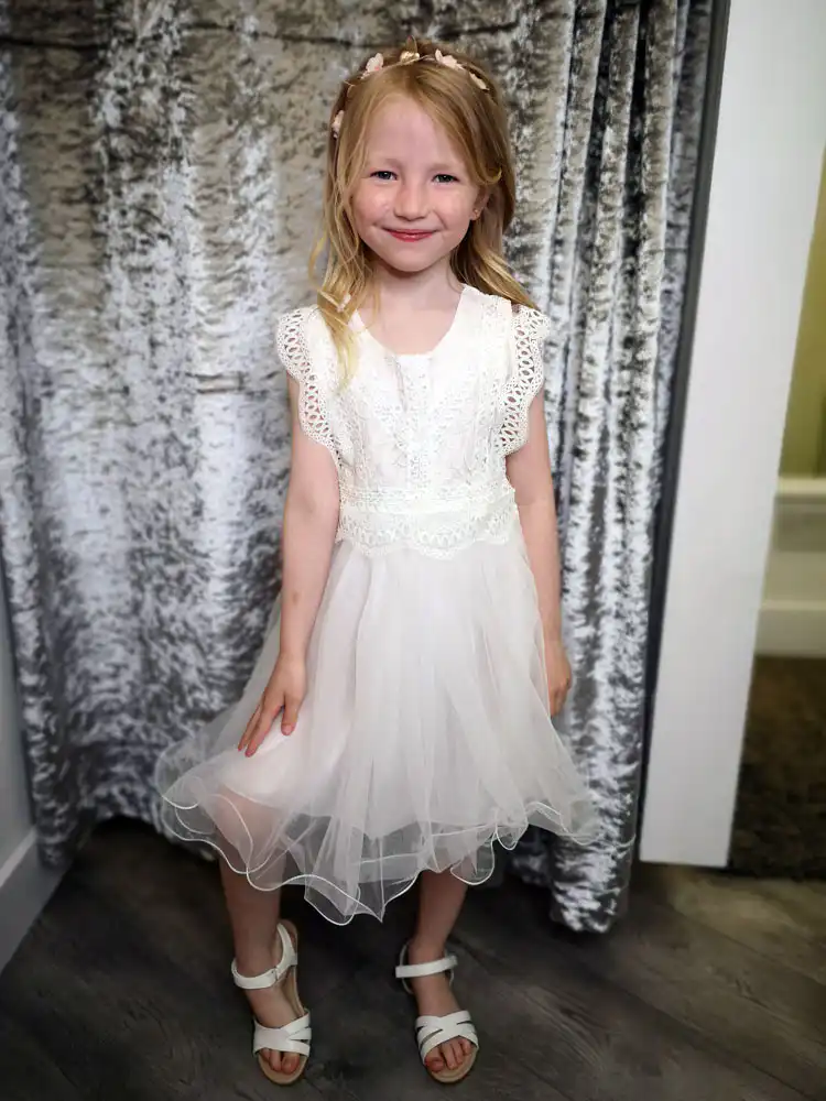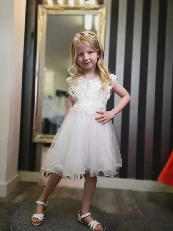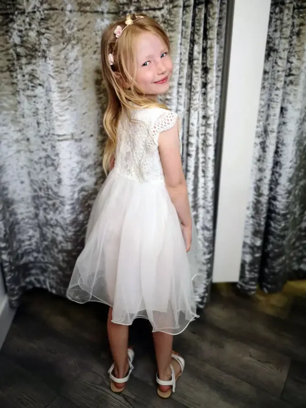 This enchanting ivory dress features a delicate lace bodice with flutter sleeves and a soft, flowing tulle skirt that gives it a beautifully whimsical silhouette. The round neckline and intricate crochet-style lace detailing add a touch of elegance, while the layered tulle skirt creates effortless movement and charm. Perfect for flower girls, confirmations, or any special occasion, this dreamy design is sure to make your little one feel truly magical on her big day.