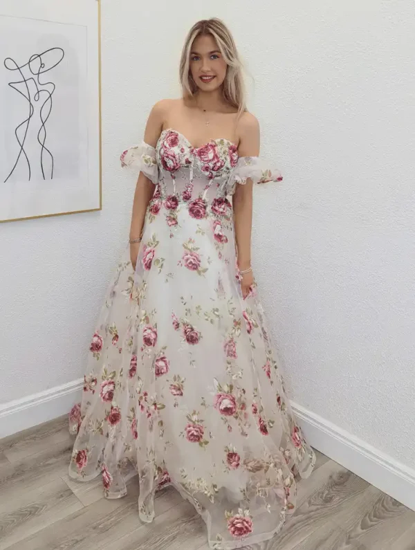 The Amiriz Floral Print Ballgown is a breathtaking ivory and blush creation, featuring an enchanting all-over rose print on soft, flowing tulle that cascades into a full, sweeping A-line skirt. The romantic off-the-shoulder sweetheart bodice is adorned with delicate 3D floral appliqués and sparkling embellishments, adding a touch of glamour to its dreamy, garden-inspired aesthetic. Perfect for your debs night, this show-stopping gown will ensure you make an unforgettable entrance. An in-store exclusive available only at Obsession Showroom.