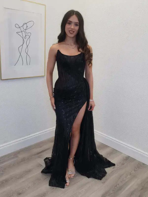 The Arabella is a showstopping black sequin gown that effortlessly blends glamour with elegance, featuring a sleek scoop neckline, fitted corset bodice, and a sultry thigh-high split that adds drama to every step. Crafted from a richly embellished sequin lace fabric with a sweeping train, this figure-flattering mermaid silhouette is designed to turn heads from the moment you walk in the room. Perfect for your debs night, the Arabella promises to make it a night you’ll never forget. An in-store exclusive available only at Obsession Showroom.