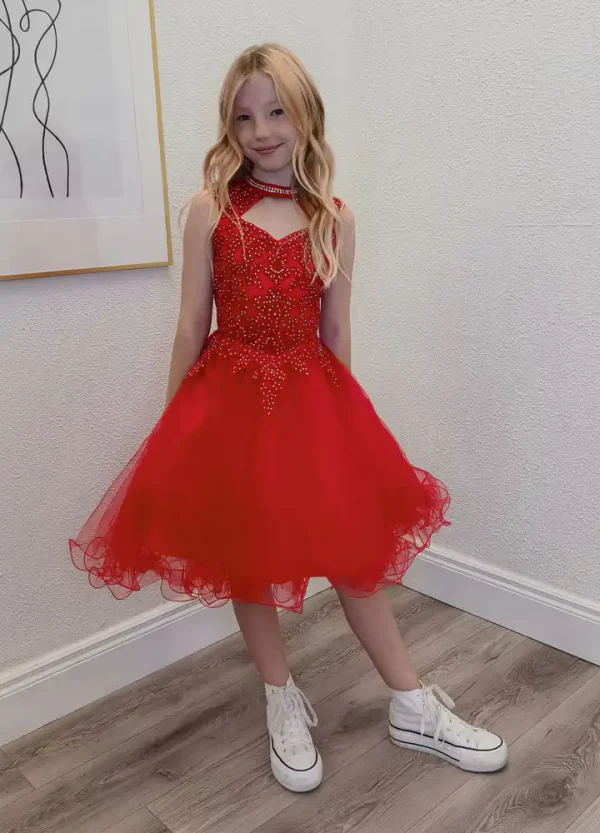 This stunning red tulle dress features a beautifully embellished halter neckline with intricate rhinestone detailing across the fitted bodice, creating a truly show-stopping effect. The full, layered tulle skirt adds a magical, princess-like silhouette that’s perfect for your special day. A gorgeous choice for Confirmation, the Ashley Red is a bold and memorable dress that will make your little girl feel like the star she truly is.