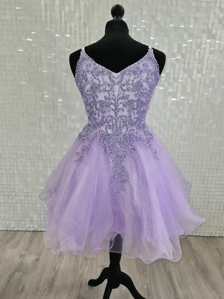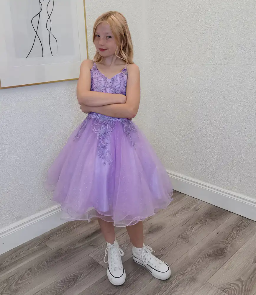 This stunning Aspen Confirmation Dress in soft lilac is sure to make a lasting impression on one of life’s most special days. Featuring a flattering V-neckline with delicate spaghetti straps, the fitted bodice is beautifully adorned with intricate silver beading and ornate lace appliqué detailing. The dress flows into a dreamy, full tulle skirt with a touch of shimmer throughout, creating an effortlessly elegant look that’s perfect for your Confirmation day.