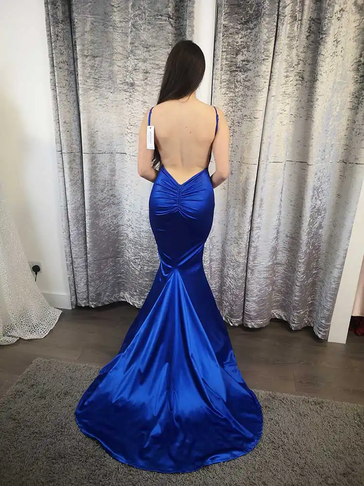Make a stunning entrance in the **Allie Royal Blue Backless Dress**, a sleek mermaid-style gown crafted from luxurious satin that catches the light beautifully with every step. Featuring a deep V-neckline, delicate spaghetti straps, and a dramatic sweep train, this dress hugs every curve before flaring into an elegant finish. Perfect for your debs night, this show-stopping style is available to try on at Obsession Showroom in Carlow.