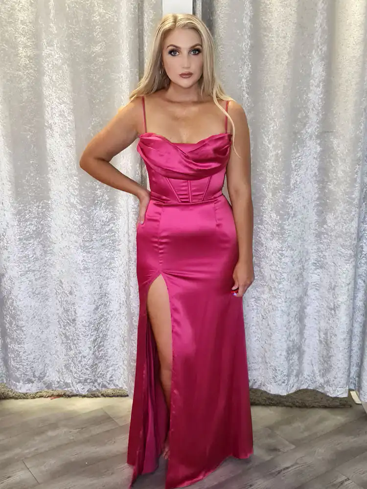 Make a bold statement at your debs in the Chloe Satin Corset Dress, a stunning hot pink gown crafted from luxurious satin that catches the light beautifully as you move. Featuring a draped cowl neckline, delicate spaghetti straps, a structured boned corset bodice, and a figure-flattering mermaid silhouette with a daring front split, this dress is designed to turn heads from the moment you walk in. Don’t miss your chance to own this showstopping piece — available now at a special sale price exclusively at Obsession Showroom.