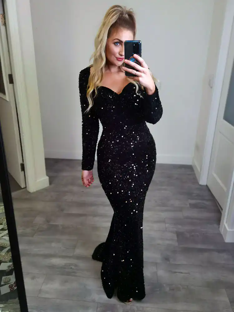 Make a statement in the **Jules Black Sequin Dress**, a show-stopping floor-length gown that combines timeless glamour with a modern, body-hugging mermaid silhouette. Crafted from an all-over black sequin fabric with long sleeves and a sweetheart neckline, this dress catches the light beautifully with every move you make. Perfect for your debs night, this sale gem is the ultimate choice for the girl who wants to turn heads from the moment she walks in the room.