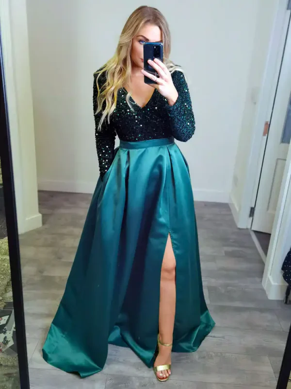 Make a stunning entrance in the Mariah Emerald Green Ballgown, featuring a richly embellished sequin and beaded long-sleeve bodice with an elegant V-neckline that transitions beautifully into a flowing, full-length satin skirt with a daring thigh-high split. The deep emerald hue adds a luxurious, jewel-toned richness that catches the light from every angle, making it the perfect choice for your debs night. Finished with a structured A-line silhouette and gold heel-friendly hem, this show-stopping gown is designed to make you feel like the star of the evening.