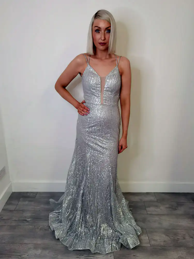 Make a stunning entrance in this Silver Sparkle Gown, a breathtaking floor-length fitted silhouette that catches the light with every step thanks to its all-over silver metallic glitter fabric. Featuring delicate double spaghetti straps, a plunging V-neckline with a sheer insert, and a sweeping mermaid-style train, this gown is designed to turn heads from every angle. A showstopping choice for your debs night, and now available at a special sale price — your dream dress moment is waiting at Obsession Showroom.