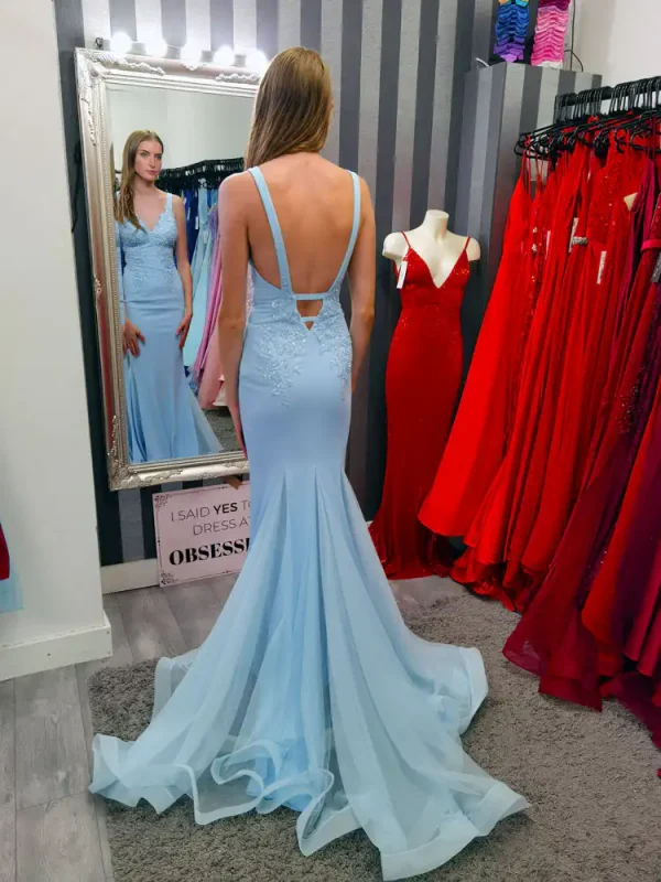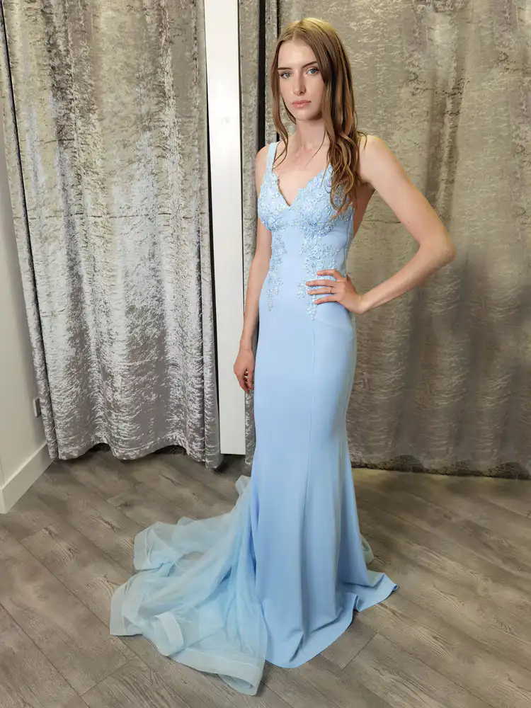 This stunning Baby Blue Mermaid Dress is the perfect choice for your debs night, featuring a flattering mermaid silhouette with a graceful sweeping train that commands attention with every step. The delicate V-neckline is beautifully adorned with intricate floral lace appliqué detailing across the bodice, flowing seamlessly into the smooth, sleek skirt fabric for an effortlessly elegant finish. Whether you’re making your grand entrance or dancing the night away, this dreamy sky blue gown is sure to leave a lasting impression. An in-store exclusive available only at Obsession Showroom.