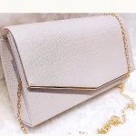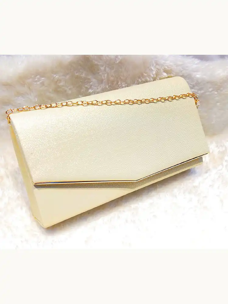 This elegant Gold Shimmer Clutch Bag features a lustrous ivory-gold satin fabric with a beautiful pearlescent sheen, giving it an effortlessly glamorous finish. The sleek envelope-style silhouette is elevated by a polished gold-tone frame clasp and a delicate gold chain strap, making it as practical as it is stunning. Perfect for debs, weddings, or any formal occasion, this timeless clutch is the ideal finishing touch to complete your look.