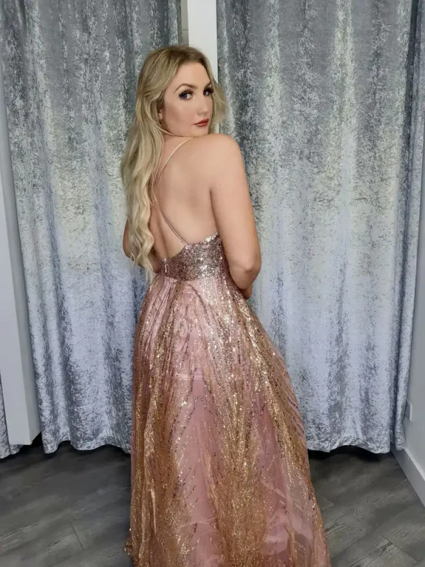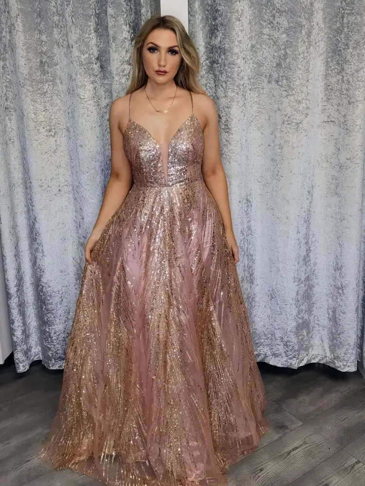 Bella Rose Gold Gown is a showstopping floor-length ballgown that blends blush pink and rose gold in a breathtaking cascade of all-over sequin and glitter fabric, catching the light with every step. The elegant A-line silhouette is beautifully balanced by delicate spaghetti straps and a deep V-neckline, creating a look that is effortlessly glamorous and utterly unforgettable for your debs night. An in-store exclusive available only at Obsession Showroom.