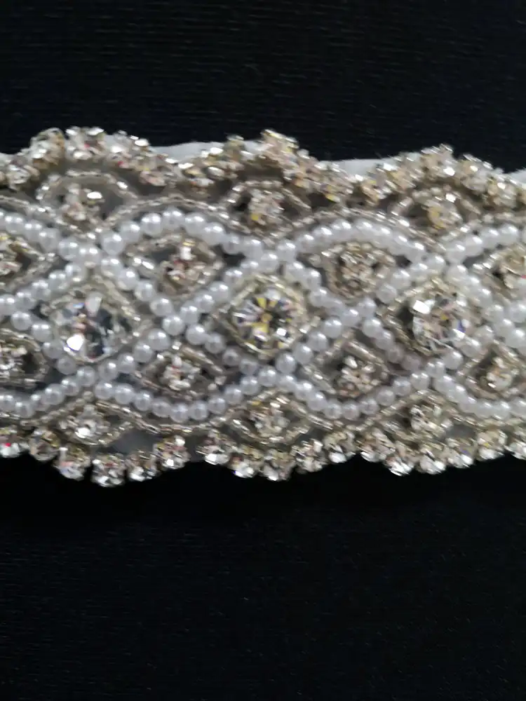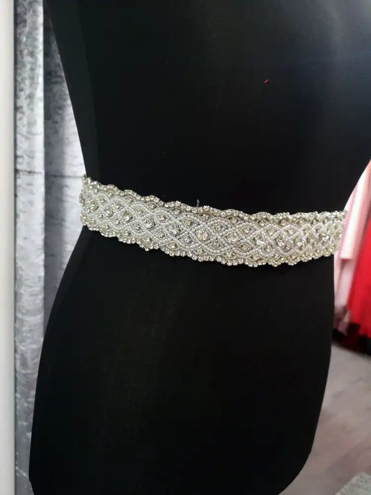 This stunning crystal and pearl bridal belt features an intricate interlocking diamond lattice design, beautifully handcrafted with shimmering rhinestones and delicate seed beads in a radiant silver tone. The wide, ornate design adds a luxurious focal point to any gown, catching the light effortlessly with its dazzling embellishment. Perfect for brides, debs, or bridesmaids looking to elevate their look with a touch of glamour and sophistication.