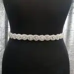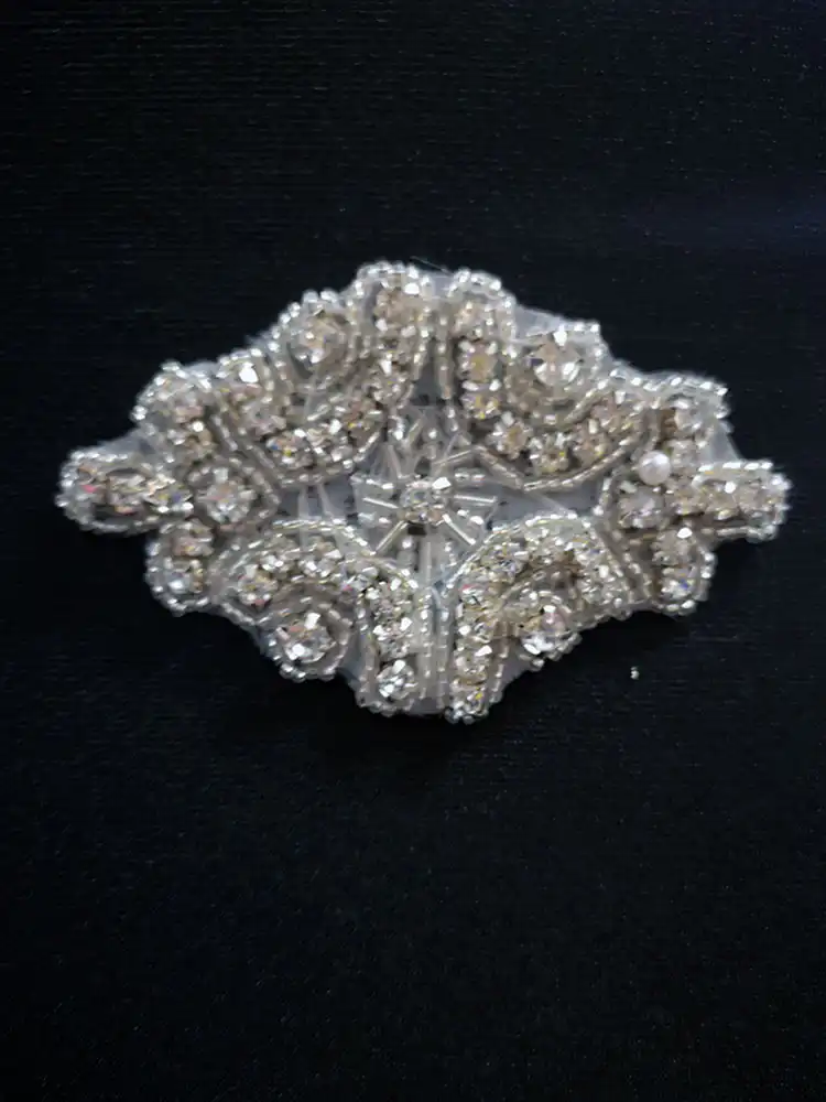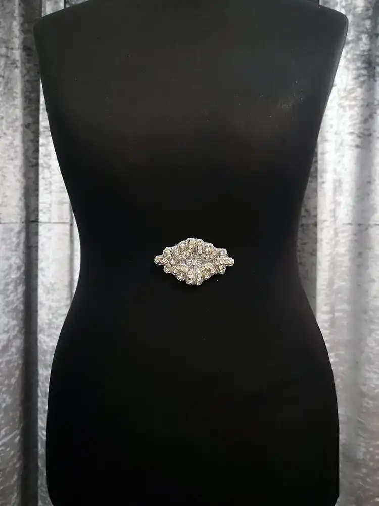 A stunning crystal rhinestone appliqué belt clip, crafted with layers of sparkling clear stones set in intricate silver-toned swirling motifs on a sheer base. The diamond-shaped design is densely embellished with pavé-set crystals and seed beads, catching the light beautifully from every angle. Perfect for elevating a wedding gown, bridesmaid dress, or debs gown, this glamorous accessory adds an instant touch of vintage-inspired elegance to any formal look.