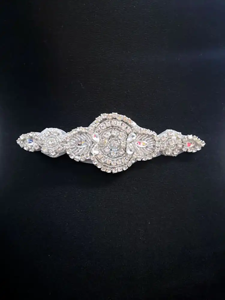 This stunning crystal bridal belt features an intricate Art Deco-inspired centrepiece adorned with clusters of sparkling rhinestones and iridescent AB crystals, creating a breathtaking focal point at the waist. The elongated, tapered design adds elegant structure and glamour, making it the perfect finishing touch for a wedding gown, bridesmaid dress, or formal evening look. A truly luxurious accessory that effortlessly elevates any occasion outfit with timeless, show-stopping sparkle.