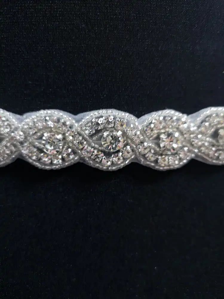 This stunning silver crystal sash belt features an intricate braided design adorned with sparkling rhinestones and diamanté clusters, creating an elegant twisted pattern that catches the light beautifully. Crafted with fine beadwork and shimmering crystals throughout, this delicate yet eye-catching piece adds a touch of glamour to any outfit. Perfect for brides, bridesmaids, debs, or confirmation wear, it effortlessly elevates a gown from beautiful to truly unforgettable.