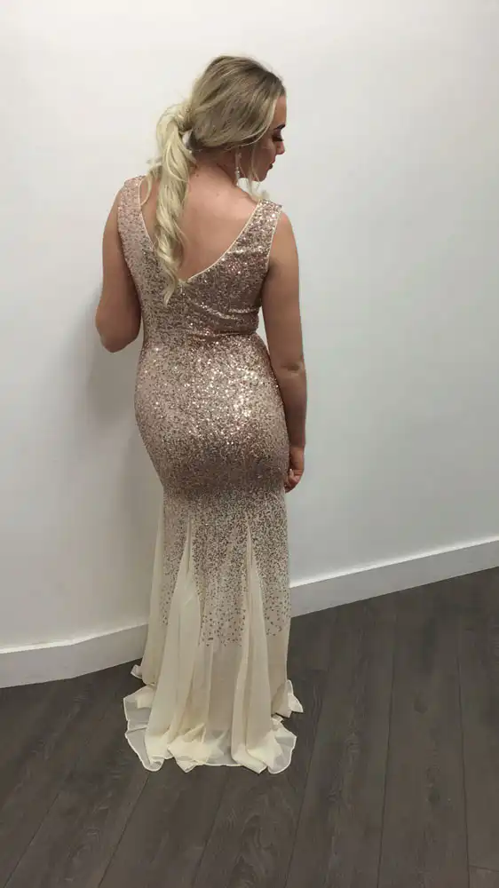 Billie is a showstopping rose gold sequin mermaid gown that’s guaranteed to turn heads on your debs night. Featuring a flattering V-neckline and a sleek, body-hugging silhouette, the dress transitions beautifully from dense all-over sequins into a dreamy ivory chiffon fishtail hem, creating an elegant and glamorous finish. Available now at a special sale price in our Carlow boutique, Billie is the perfect choice for the girl who wants to shine from the moment she walks in the door.