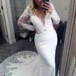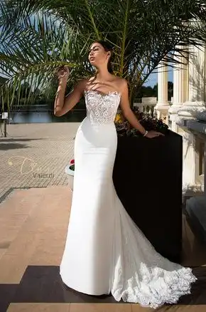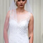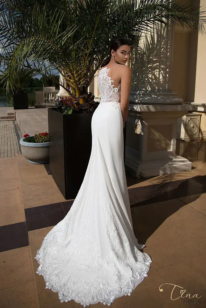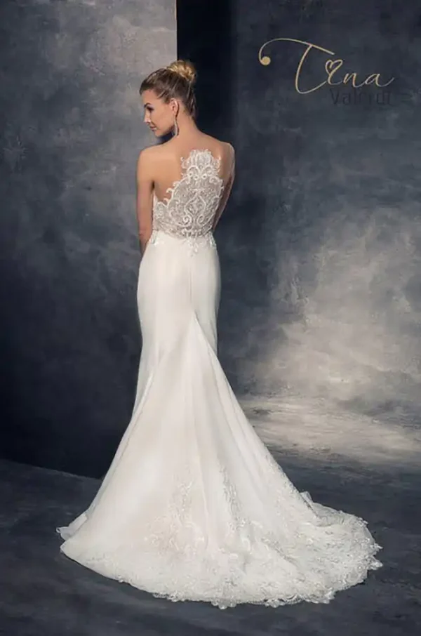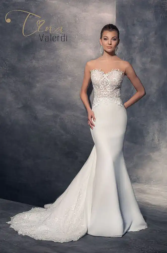 A breathtaking vision in ivory, the Blanka Wedding Gown features a sleek, figure-hugging silhouette with a stunning illusion sweetheart bodice adorned in intricate floral and scrollwork lace with delicate beading and embroidery. The sheer corset-style top transitions seamlessly into a smooth, minimalist skirt, creating the perfect balance of romance and modern sophistication. An exquisite choice for the contemporary bride who wants to make an unforgettable statement on her wedding day.