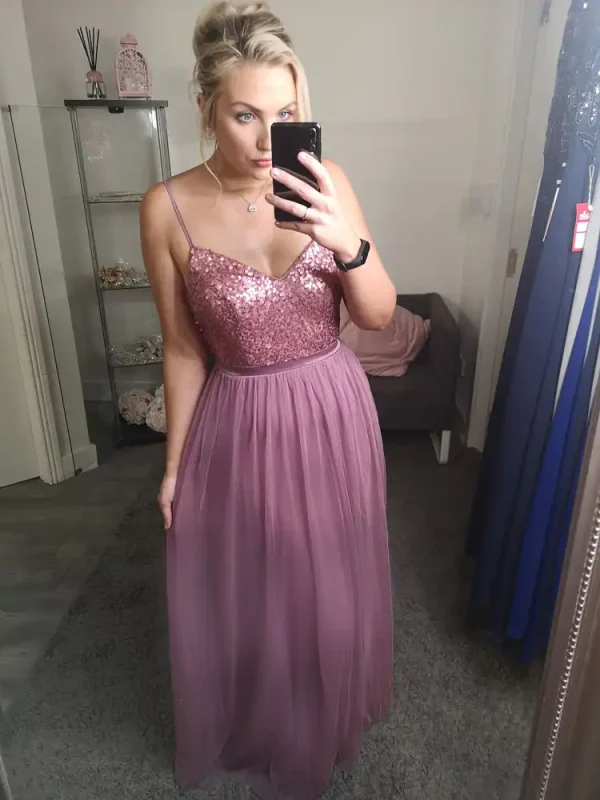 This stunning Bride706 Mauve Pink Bridesmaid Dress features a romantic A-line silhouette with a sweetheart neckline and delicate spaghetti straps, perfect for creating an effortlessly elegant bridal party look. The eye-catching sequin bodice adds a touch of glamour, flowing beautifully into a soft, floaty tulle skirt in a gorgeous dusty mauve pink hue. An ideal choice for bridesmaids who want to strike the perfect balance between sparkle and sophistication on your special day.