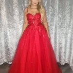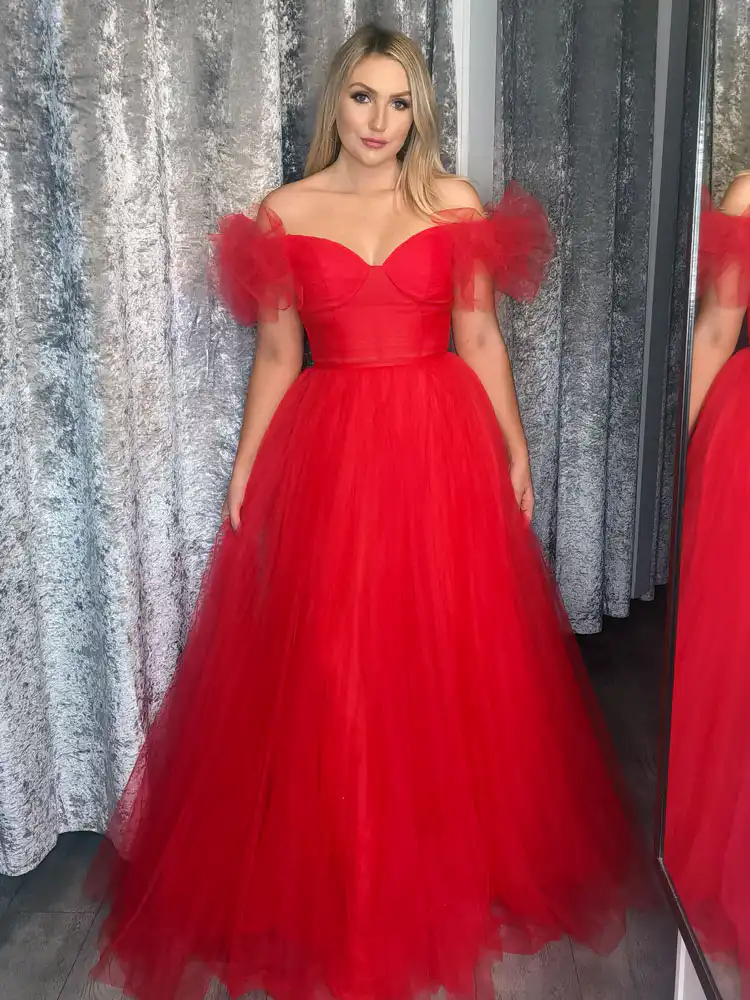 Make a breathtaking entrance in the California Ballgown, a stunning red tulle creation that effortlessly combines romance and drama. Featuring an off-the-shoulder sweetheart neckline adorned with soft ruffled tulle sleeves, a structured fitted bodice, and a voluminous full-length skirt, this gown is the ultimate showstopper for your debs night. An in-store exclusive available only at Obsession Showroom.