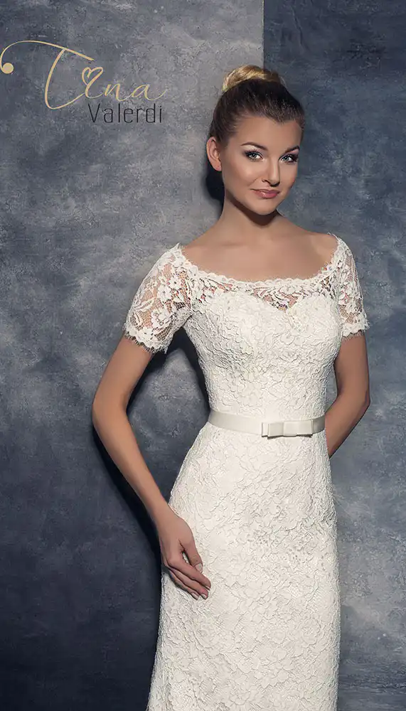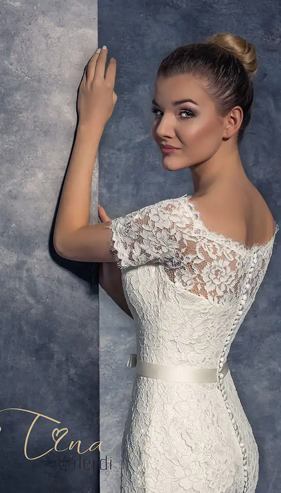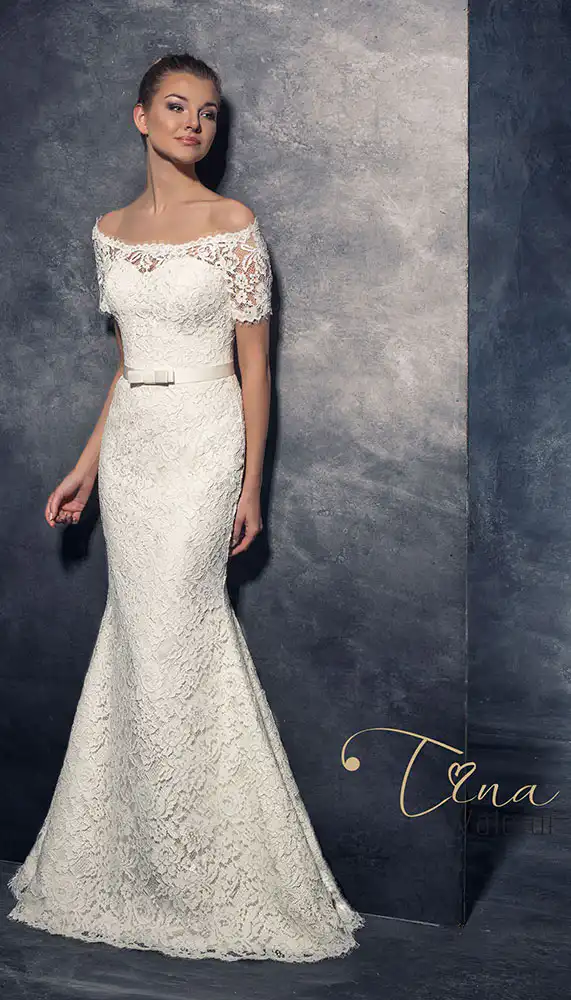 This stunning ivory lace gown from Tina Valerdi features a romantic off-the-shoulder neckline with delicate short sleeves, creating an effortlessly elegant silhouette. The all-over floral lace fabric is beautifully detailed throughout, from the sheer illusion bodice to the sleek, figure-skimming skirt, finished with a dainty satin bow belt at the waist. The Camelia is the perfect choice for the modern bride who wants timeless sophistication with a touch of vintage charm.