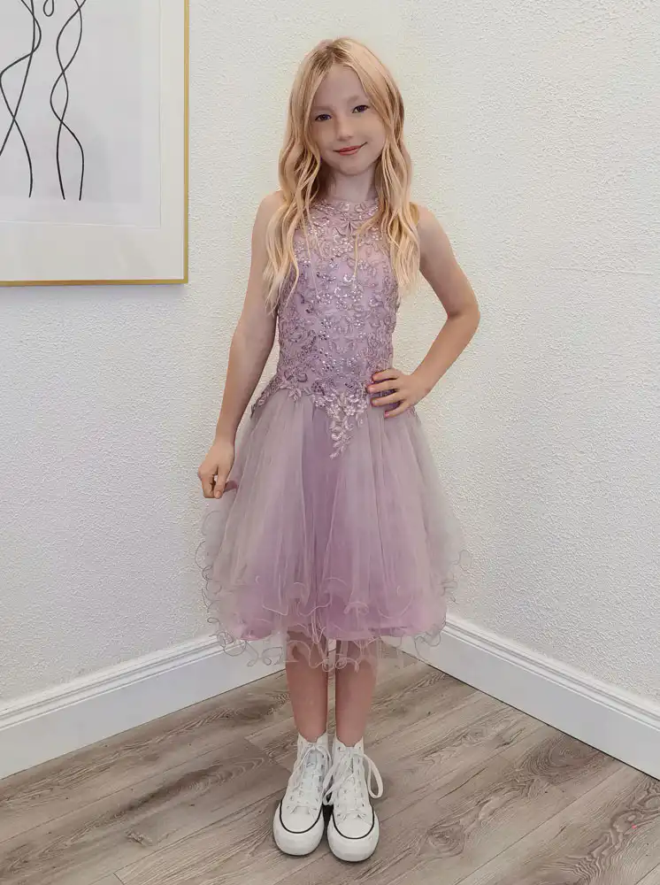 This enchanting Capri dress in soft mauve pink features a delicate lace and sequin embroidered bodice with intricate floral appliqué detailing, perfectly complemented by a floaty, layered tulle skirt that gives it a beautiful, effortless movement. The sleeveless design with its elegant high neckline strikes the perfect balance between age-appropriate and utterly special, making it an ideal choice for your daughter’s Confirmation day. A truly memorable dress that will shine in every photograph and create lasting memories of this important milestone.