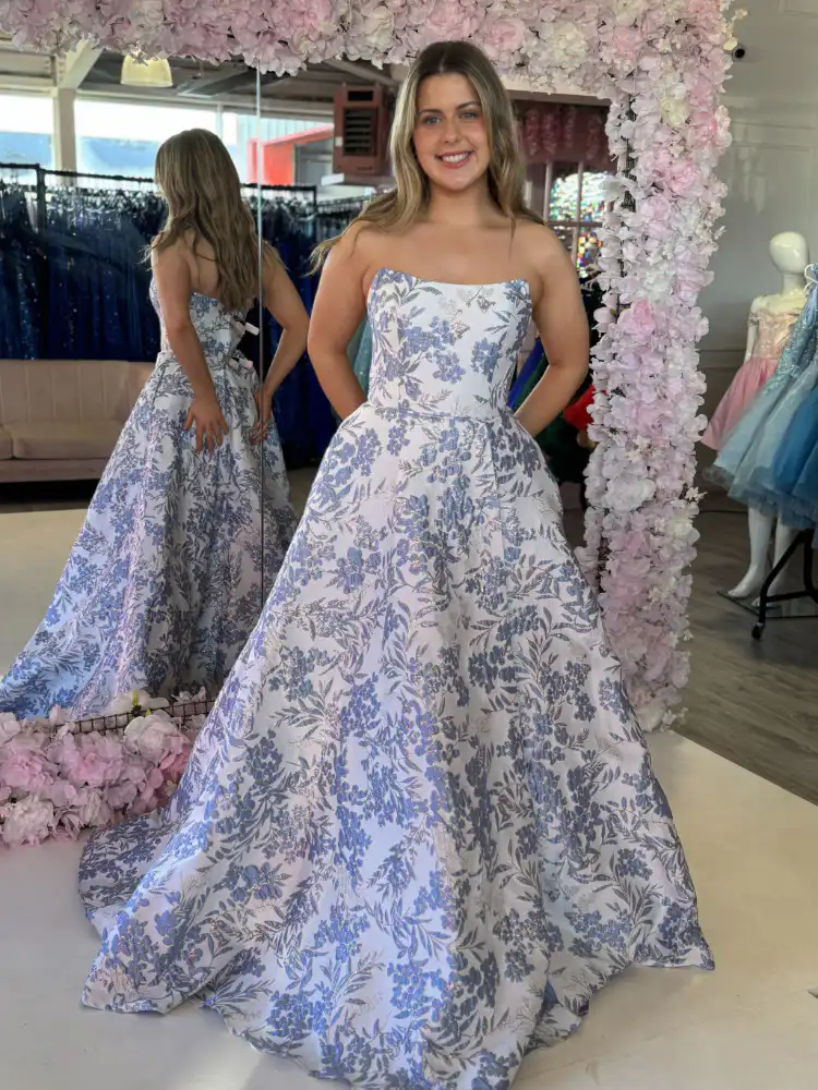 The Cara Floral Print Gown is a stunning strapless A-line ballgown featuring an all-over blue and white botanical print that gives it a fresh, garden-party elegance with true show-stopping impact. Crafted in a structured, full-skirted silhouette complete with pockets, this gown combines timeless romance with effortless practicality — perfect for making a memorable entrance at your debs. An in-store exclusive available only at Obsession Showroom.
