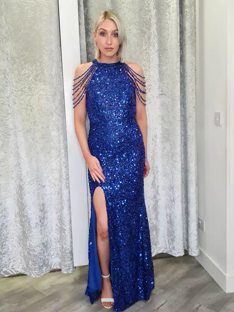 Make a statement this debs season in the Charlotte Halter Sequin Gown, a stunning floor-length silhouette crafted entirely in eye-catching royal blue sequin fabric that catches the light with every move. Featuring an elegant halter neckline adorned with cascading beaded shoulder drapes and a daring thigh-high split, this gown effortlessly blends glamour with sophistication. Available now at a special sale price in our Carlow boutique, the Charlotte is the perfect choice for any young woman who wants to truly shine on her big night.