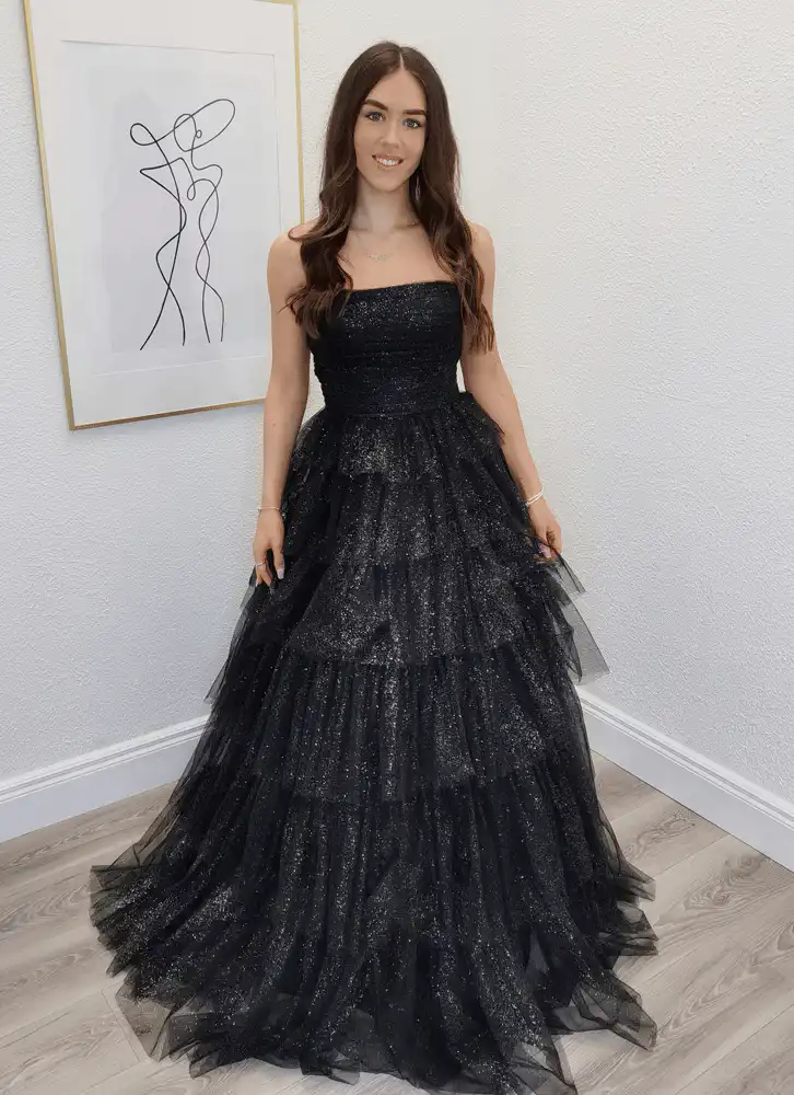 Make a stunning entrance in the **Cliona Black Ballgown**, a showstopping strapless gown featuring a sweeping tiered tulle skirt with an alluring glitter finish that catches the light beautifully with every step. The fitted straight-across neckline and structured bodice create a sleek, elegant silhouette that flows effortlessly into the dramatic layered skirt, making it the ultimate choice for your debs night. This breathtaking gown is guaranteed to turn heads and leave a lasting impression on one of the most memorable nights of your life. An in-store exclusive available only at Obsession Showroom.