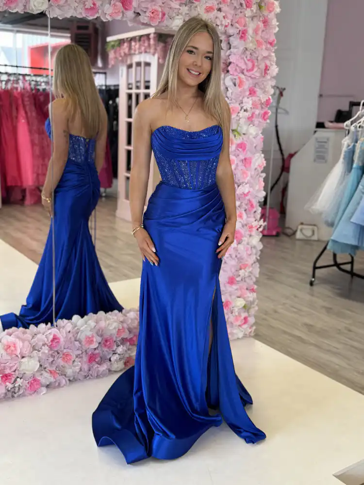 Make a stunning entrance in the Clodagh Royal Blue Fitted Dress, a sleek mermaid-silhouette gown crafted from luxurious royal blue satin with a sweetheart neckline and beautifully ruched bodice adorned with sparkling crystal embellishments. The elegant side split and flowing train add a touch of drama, making this the perfect choice for your debs night. An in-store exclusive available only at Obsession Showroom.