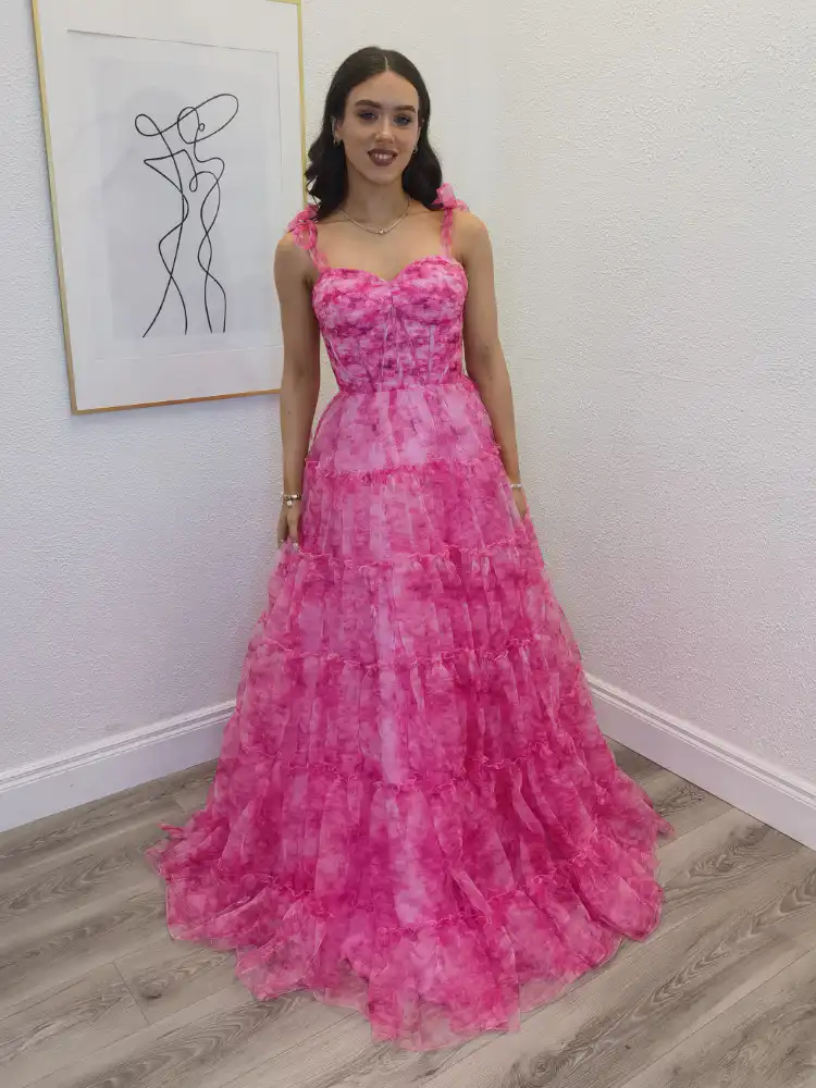 The Cody Pink Floral Ballgown is a showstopping statement piece crafted in vibrant hot pink floral organza, featuring a romantic corseted sweetheart bodice with delicate bow-tied shoulder straps and a dramatic tiered A-line skirt that sweeps beautifully to the floor. The layered ruffle detailing throughout the full skirt creates incredible movement and volume, making it the ultimate choice for your debs night. An in-store exclusive available only at Obsession Showroom.