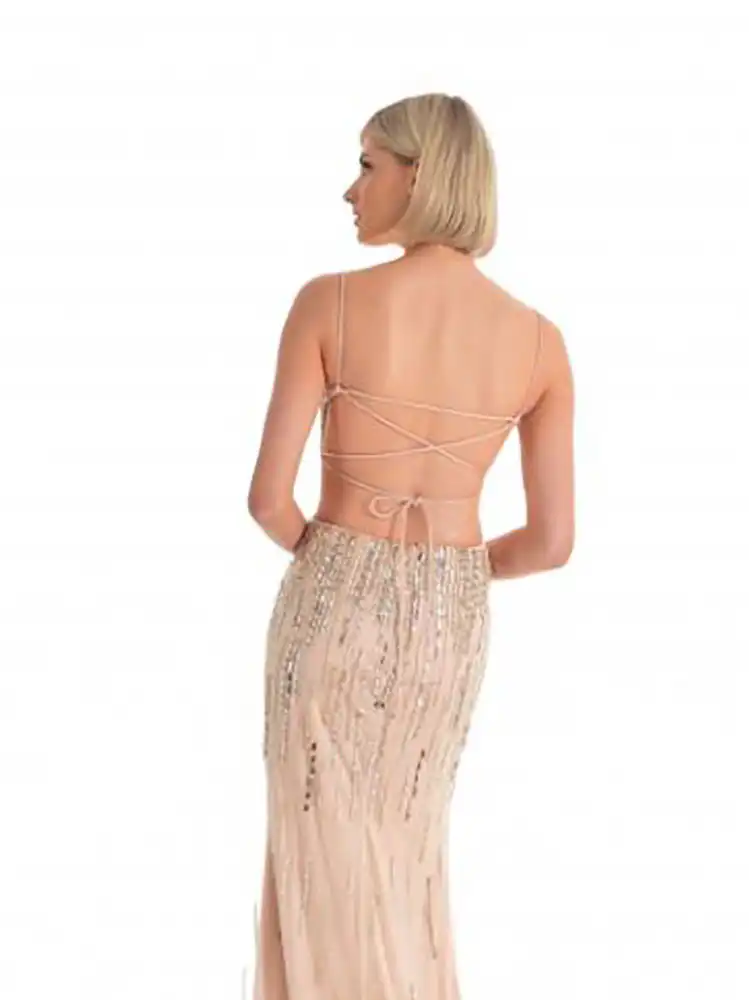 Croia Champagne Beaded Backless Evening Gown