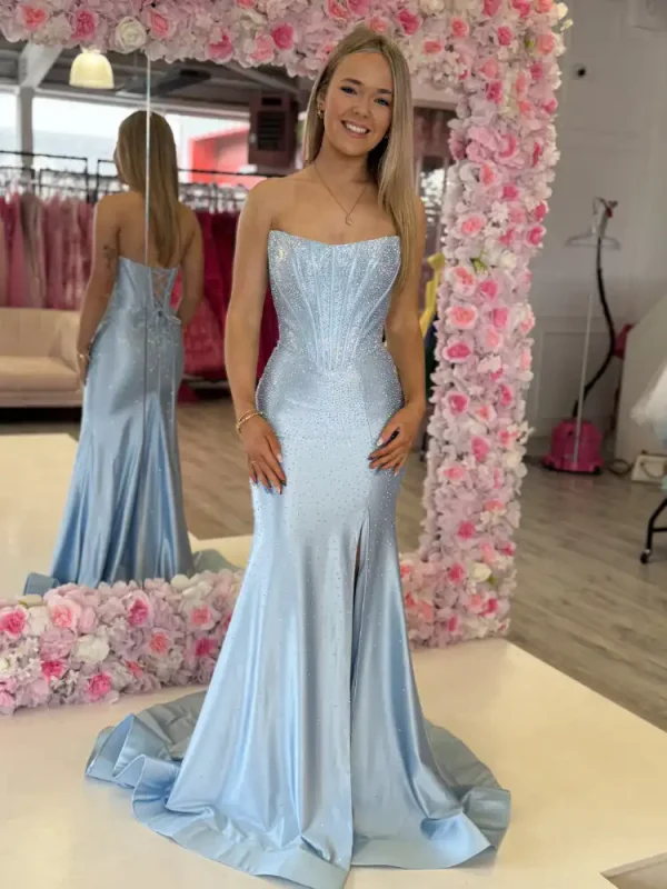 This stunning Cyprus Baby Blue Fitted Gown features a sleek mermaid silhouette crafted from luxurious satin, adorned with delicate crystal embellishments that catch the light beautifully from the structured corset bodice all the way to the flowing train. The strapless sweetheart-style neckline creates an effortlessly elegant look, while the flattering fitted cut and subtle side slit add a touch of glamour perfect for your debs night. An in-store exclusive available only at Obsession Showroom.