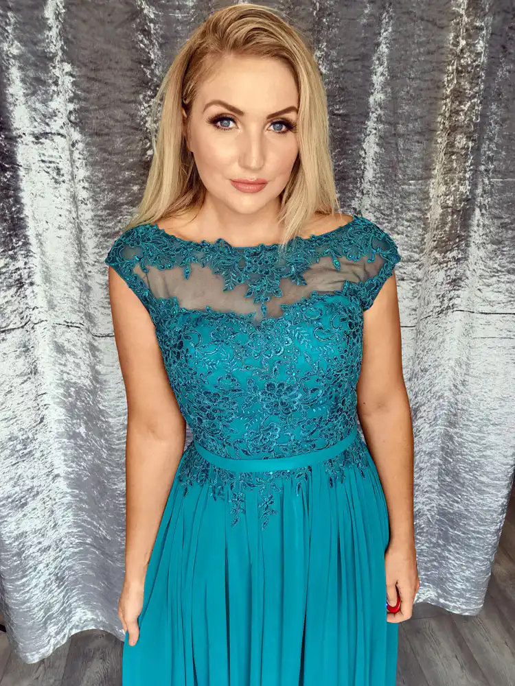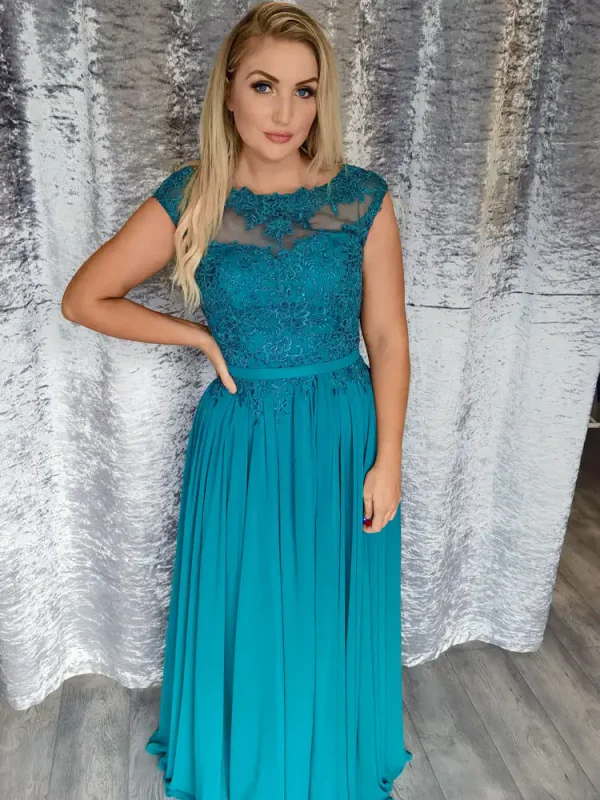 This stunning floor-length bridesmaid dress in rich teal-emerald makes an unforgettable impression with its elegant A-line silhouette and flowing chiffon skirt. The illusion bateau neckline and cap sleeves are beautifully detailed with intricate lace appliqué and delicate beading, creating a sophisticated contrast between the structured bodice and the soft, draped skirt. Perfect for weddings and formal occasions, the Dana is a timeless choice that will have your bridal party looking effortlessly elegant from ceremony to dancefloor.