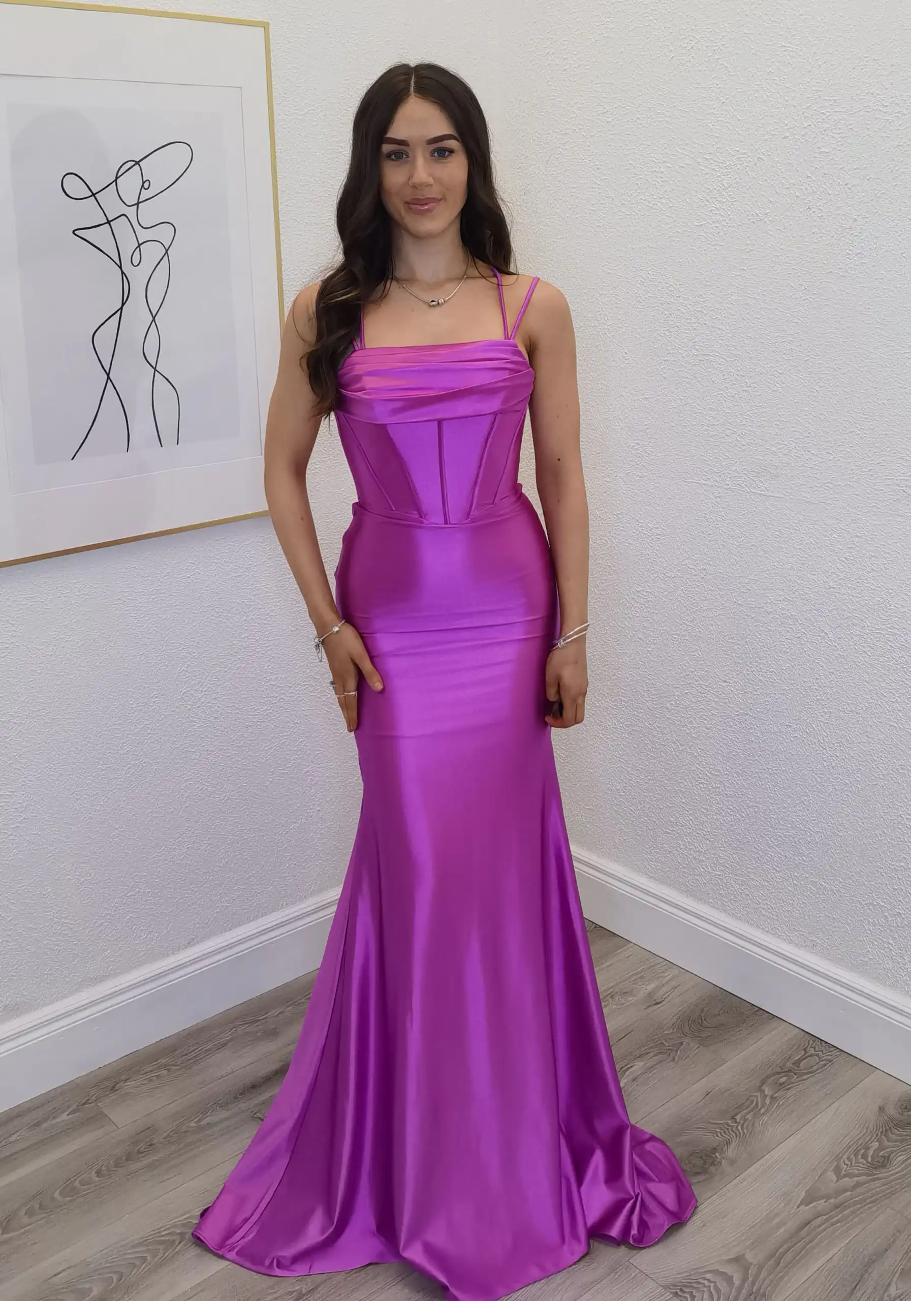 Make a bold entrance in the Desi Magenta Gown, a stunning floor-length silhouette crafted from luxurious satin fabric in a vibrant magenta hue that demands attention. Featuring a sleek square neckline with delicate double spaghetti straps, a structured corset bodice, and a figure-hugging mermaid skirt that flows into an elegant train, this gown is designed to turn heads on your debs night. An in-store exclusive available only at Obsession Showroom.