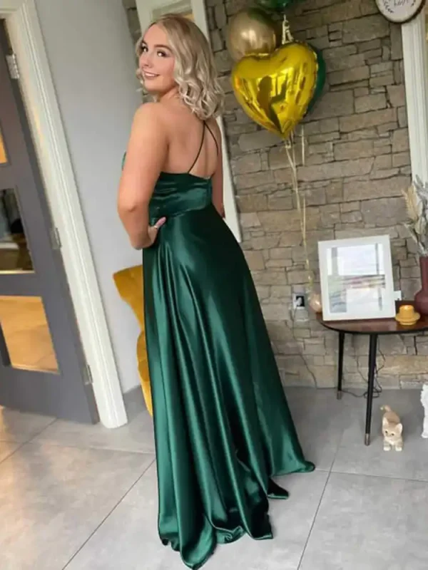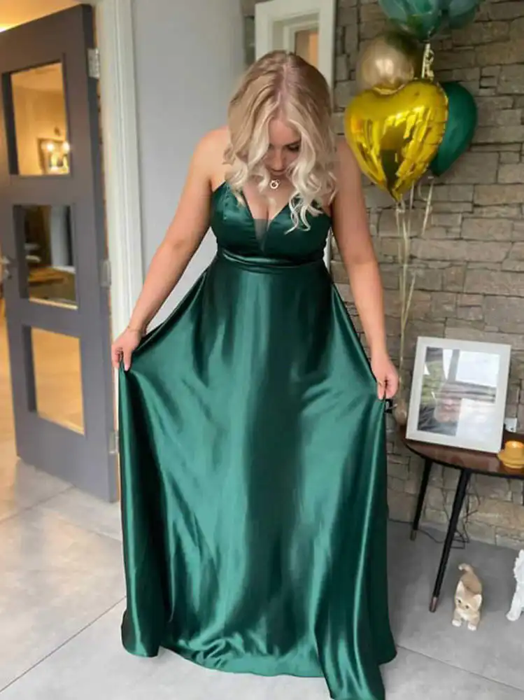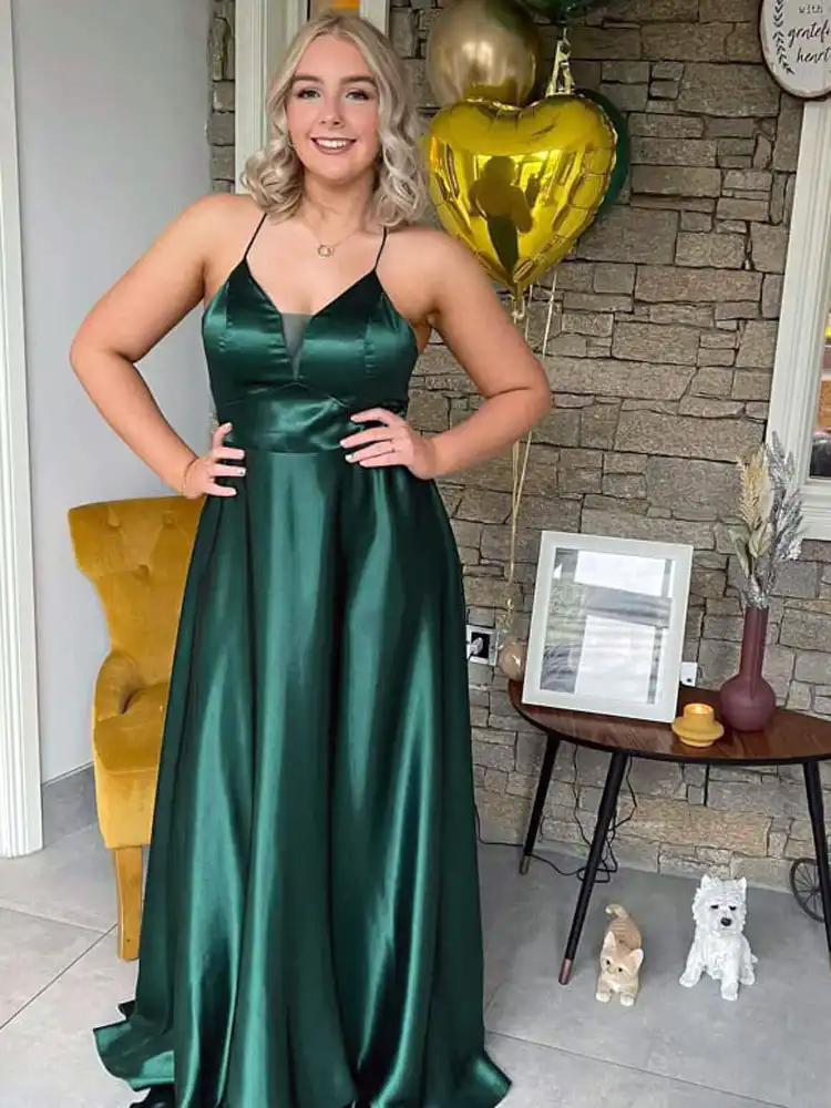 Make a stunning entrance in this gorgeous emerald green satin evening gown, featuring a sleek A-line silhouette that flows beautifully to the floor. The elegant V-neckline and delicate spaghetti straps add a touch of understated glamour, while the luxurious satin fabric catches the light for a truly show-stopping finish. Perfect for your debs night, this timeless gown is available to try on at Obsession Showroom in Carlow.