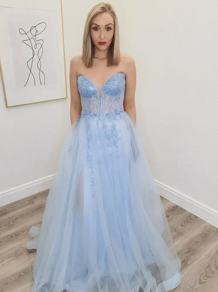 This stunning Emi Baby Blue Ballgown is a dream come true for your debs night, featuring a romantic sweetheart neckline and a breathtaking A-line silhouette crafted from layers of dreamy tulle. The heavily beaded, sheer corset bodice is adorned with delicate floral lace appliqués that cascade effortlessly into the full, flowing skirt, creating an enchanting Cinderella-inspired look. Perfect for making an unforgettable entrance on your most special night, this gown combines elegance and glamour in the most magical way. An in-store exclusive available only at Obsession Showroom.