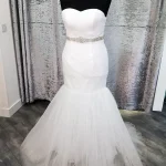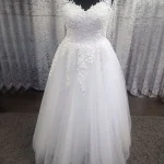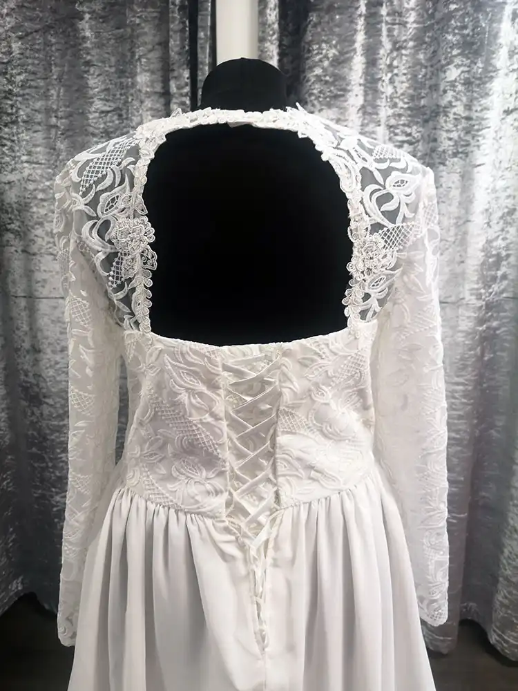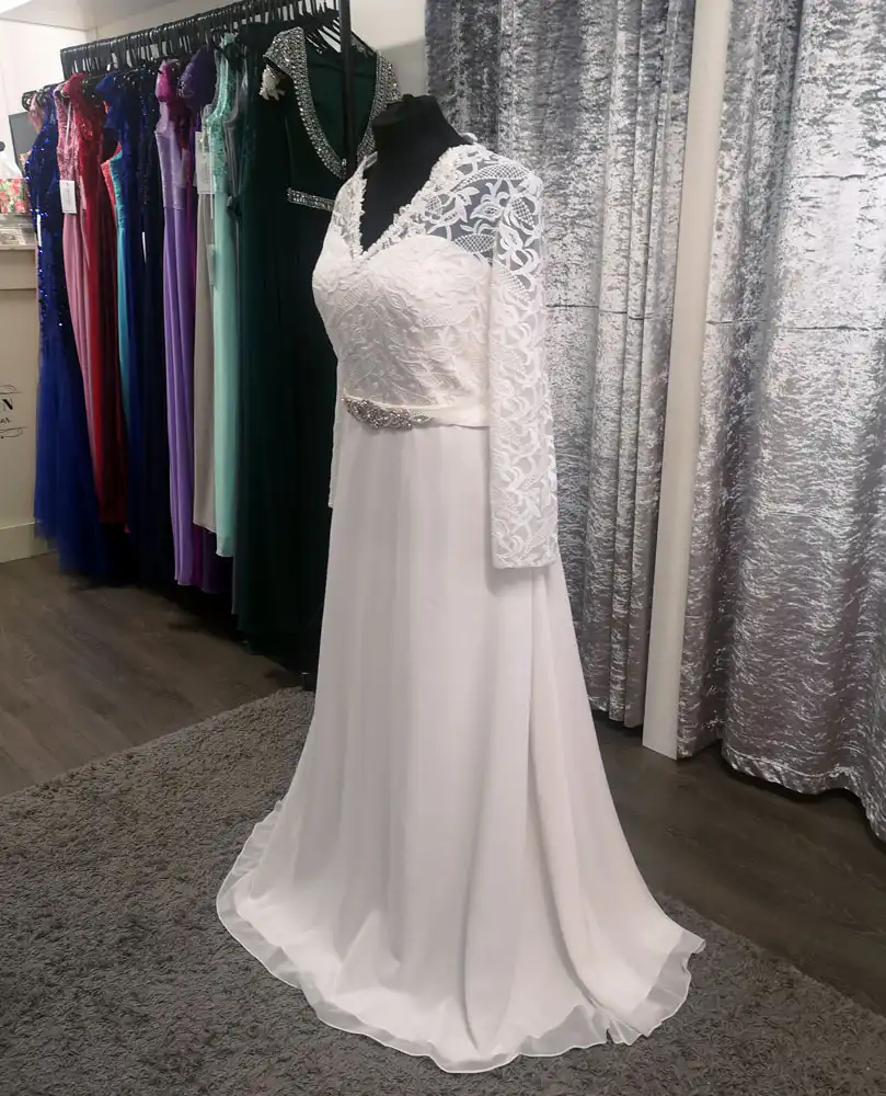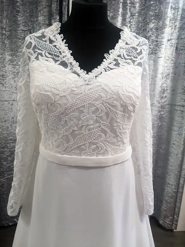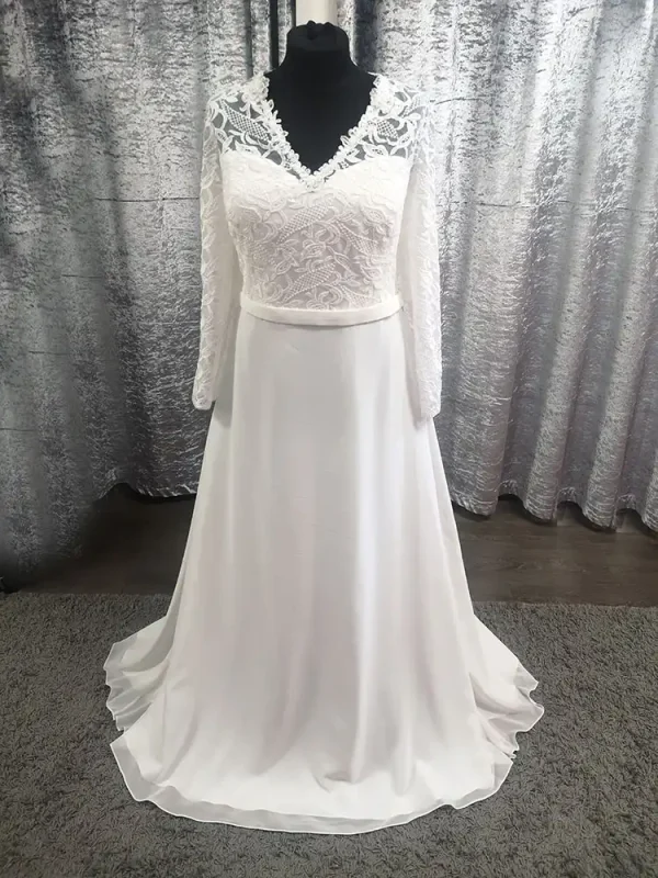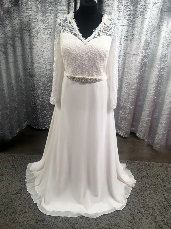 This elegant ivory A-line gown combines a richly detailed lace bodice with a flowing chiffon skirt for a look that is timelessly romantic and effortlessly graceful. The delicate V-neckline trimmed with intricate lace scalloping and the full-length lace sleeves add a touch of vintage charm, while a slim satin waistband creates a beautifully defined silhouette. The Estelle is the perfect choice for the modern bride who wants to feel covered, confident, and utterly stunning on her special day.