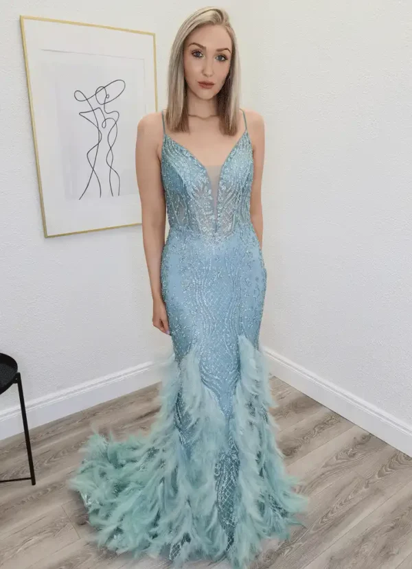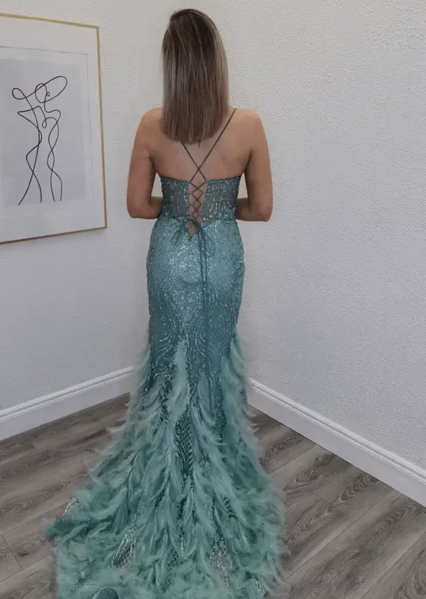 This breathtaking Galaxy Mint Feather Dress features a stunning mermaid silhouette with a deep plunge V-neckline and delicate spaghetti straps, crafted from shimmering sequin lace in the most dreamy soft mint hue. Intricate beaded embellishments catch the light beautifully throughout the fitted bodice, while a show-stopping cascade of lush feathers at the hem adds pure glamour and movement as you make your entrance. Perfect for your debs night, this gown is guaranteed to turn heads and create memories that last a lifetime. An in-store exclusive available only at Obsession Showroom.