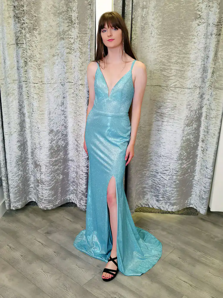 Stunning in shimmering aqua blue, the So Amazing EF50297 is a sleek, figure-hugging mermaid gown that will turn heads from the moment you walk in the room. Crafted from a gorgeous glitter-infused stretch fabric, it features a plunging V-neckline, delicate spaghetti straps, and a daring front split that adds a touch of drama to every step. Perfect for your debs night, this showstopping gown is available in two colours and is currently on sale — making it the ideal moment to snap up something truly special.