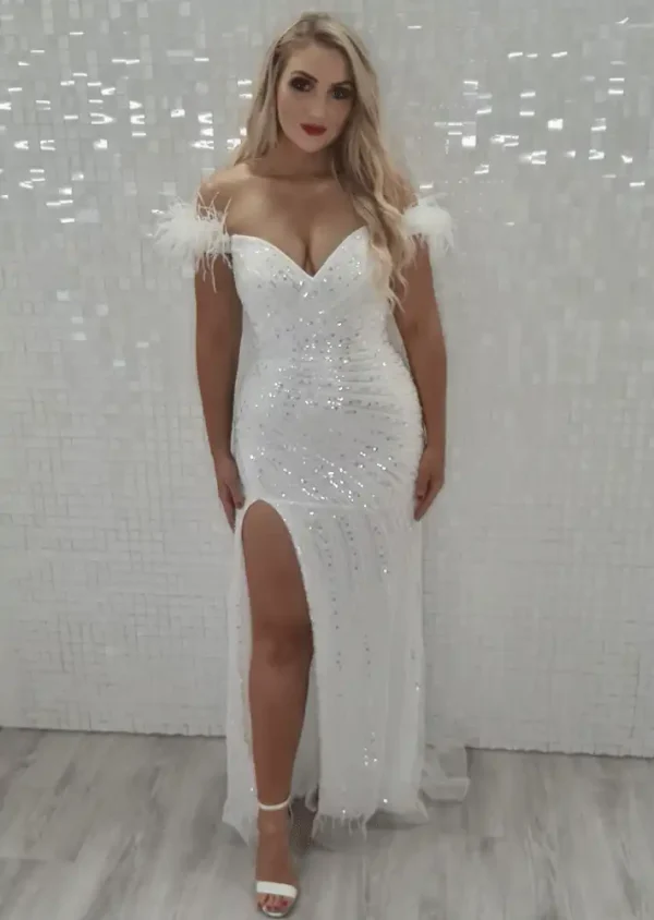 Gracie is a show-stopping white sequin gown that will turn heads from the moment you walk into the room. Featuring a sweetheart neckline with glamorous feather-trimmed off-the-shoulder straps, a figure-hugging silhouette, and a daring thigh-high split, this gown effortlessly blends Hollywood glamour with contemporary debs style. Adorned with an allover sequin and crystal embellishment that catches the light beautifully, Gracie is the ultimate choice for anyone who wants to make an unforgettable entrance on their debs night. An in-store exclusive available only at Obsession Showroom.