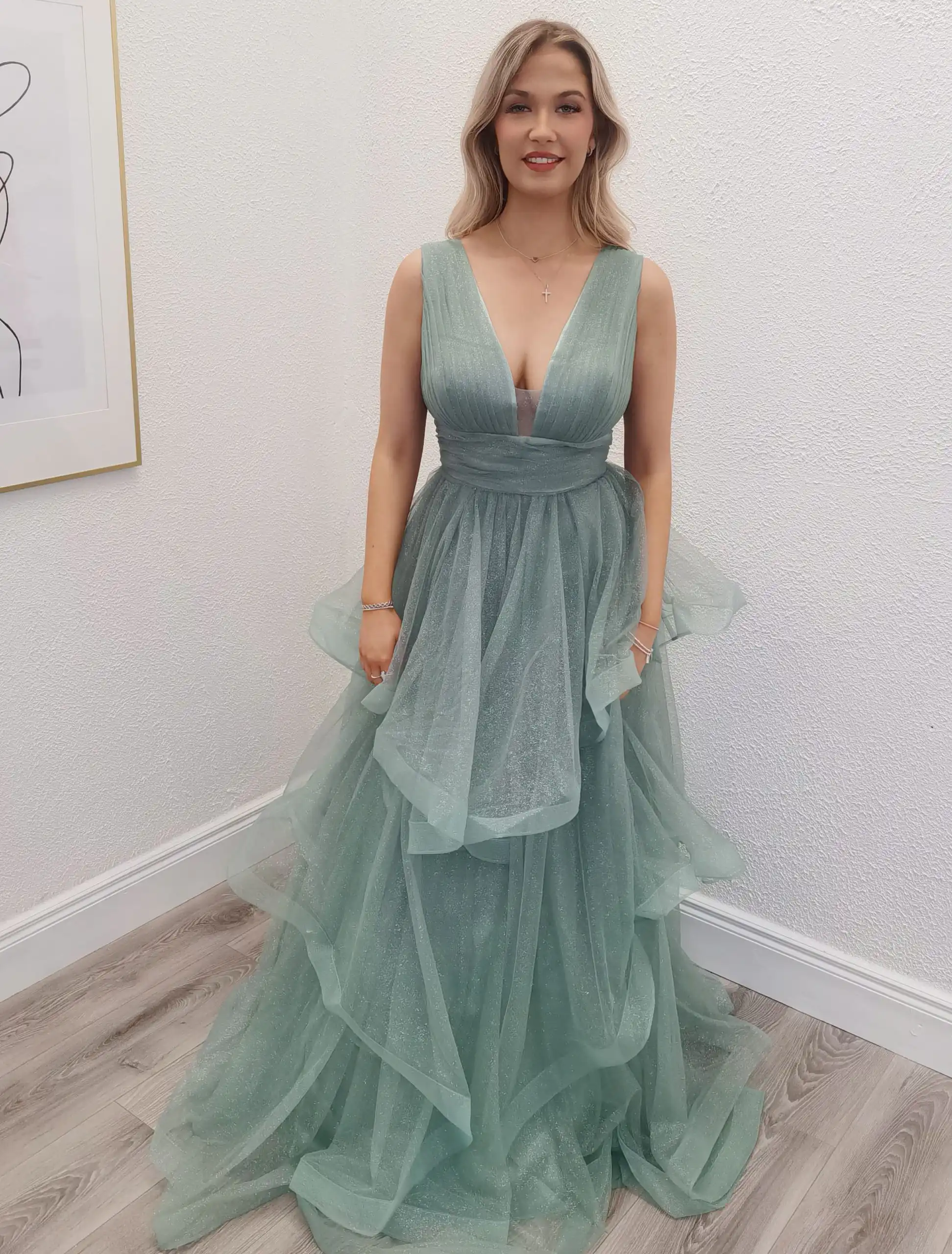 Grainne is a breathtaking sage green ballgown crafted from layers of shimmering tulle, featuring a romantic deep V-neckline and a cinched waist that flows into a dramatic, cascading ruffled skirt. The subtle glitter woven through the fabric catches the light beautifully, making it an unforgettable choice for your debs night. An in-store exclusive available only at Obsession Showroom.