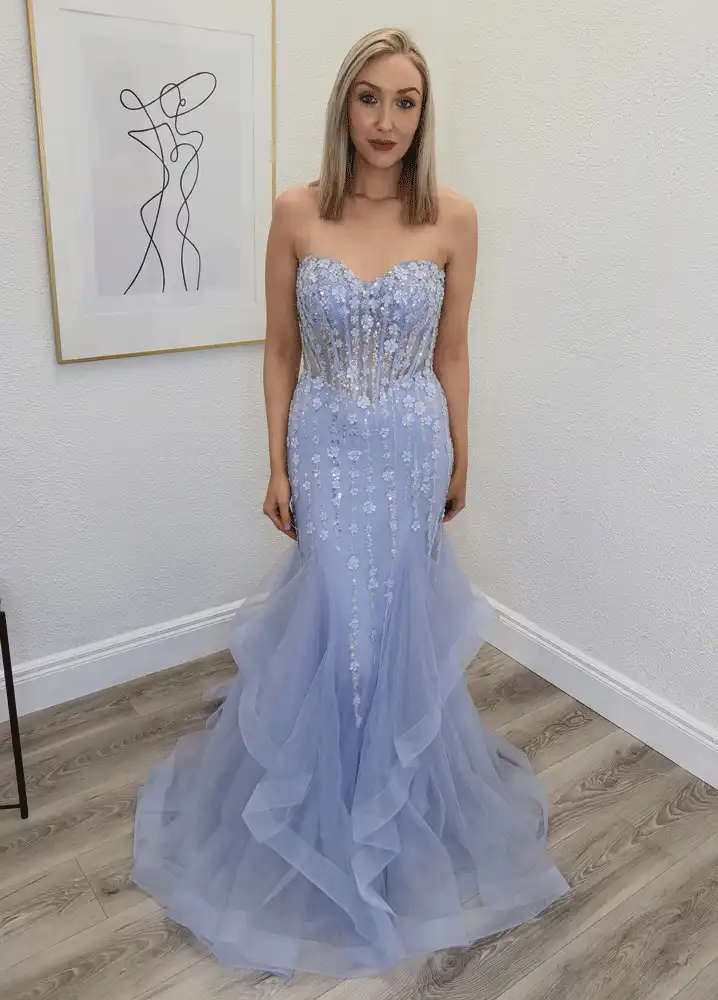 This dreamy periwinkle blue mermaid gown features a sweetheart neckline with a sheer boned corset bodice adorned with delicate 3D floral appliqués and shimmering sequin details throughout. The skirt cascades into a dramatic ruffled tulle skirt, creating an effortlessly glamorous silhouette that is guaranteed to turn heads on your debs night. An in-store exclusive available only at Obsession Showroom.