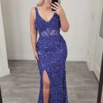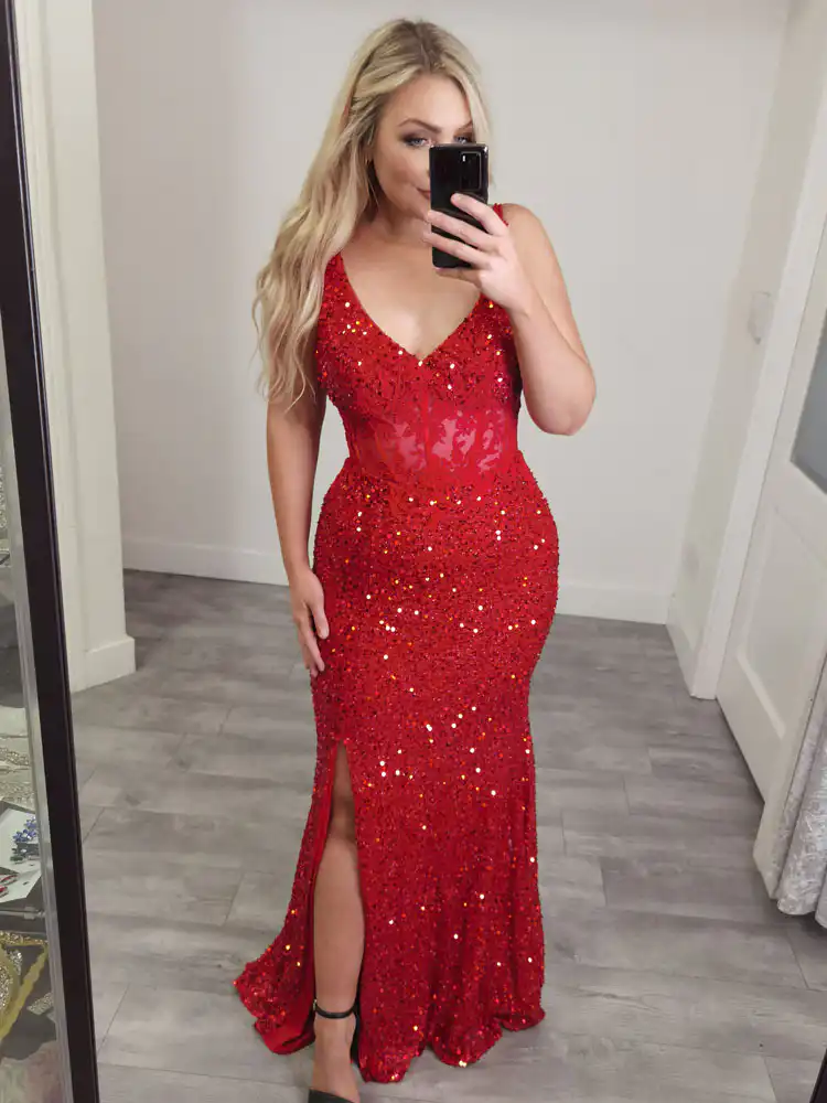 Make a bold entrance in the ViVi Red Sequin Corset Gown, a showstopping floor-length mermaid silhouette crafted from richly embellished sequin fabric that catches the light with every step. Featuring a flattering V-neckline, a fitted corset bodice with delicate lace detailing, and a daring front split, this gown is designed to turn heads from the moment you arrive. A stunning choice for your debs night — and now available at a special sale price, it’s the perfect opportunity to secure your dream dress.