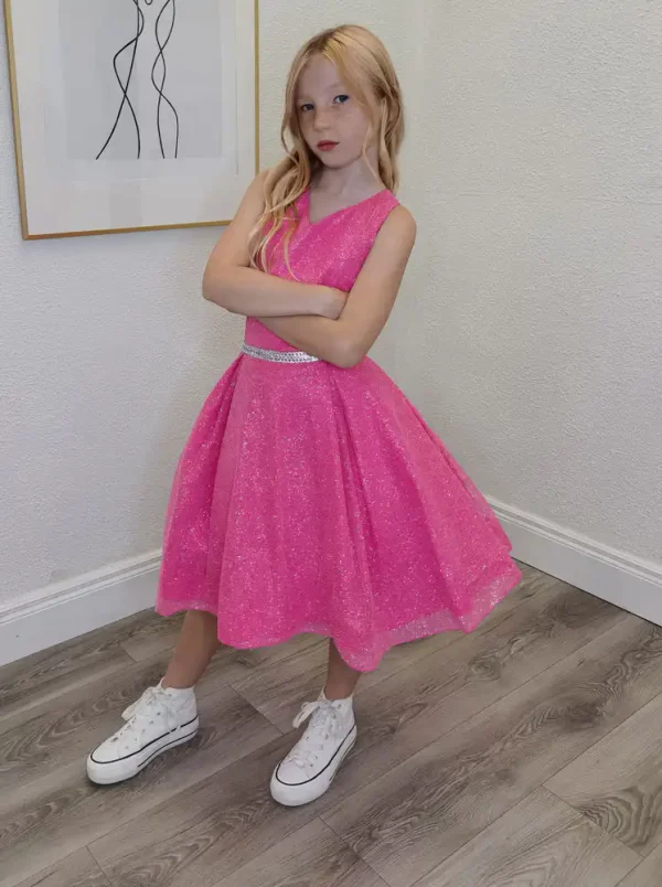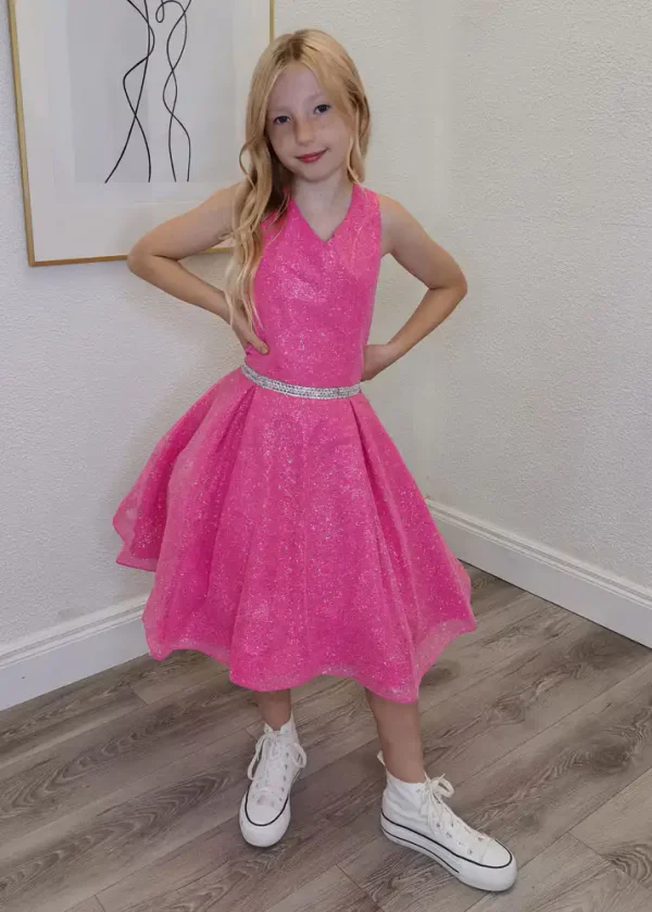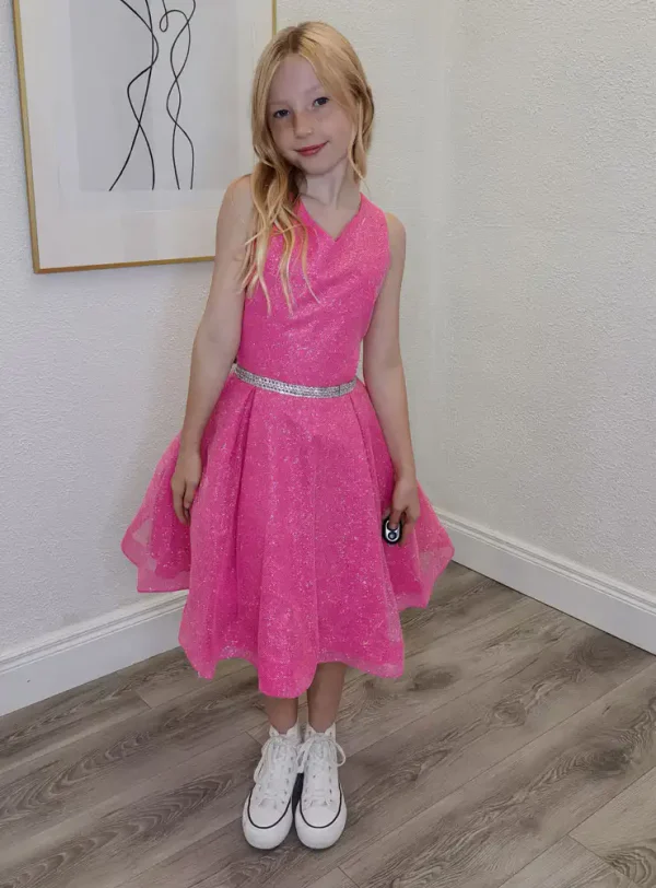 This show-stopping Indiana dress in vibrant hot pink is crafted from a shimmering glitter organza fabric that catches the light beautifully with every move. Featuring a elegant V-neckline halter bodice, a full circle skirt silhouette, and a sparkling diamanté belt at the waist, this dress is designed to make your special day truly unforgettable. Perfect for Confirmation and other milestone celebrations, it pairs effortlessly with white high-tops for a fun, modern look or dressy heels for a more classic finish.