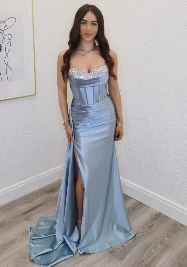 The Julie Light Blue Gown is a breathtaking floor-length satin dress in a soft, luminous steel blue, featuring a structured corset bodice adorned with sparkling crystal and pearl embellishments along the sweetheart neckline. The sleek mermaid silhouette is beautifully enhanced by elegant ruched detailing at the hip and a sultry front split, creating a look that is equal parts glamorous and graceful. Perfect for your debs night, this stunning gown is guaranteed to turn heads from the moment you walk in. An in-store exclusive available only at Obsession Showroom.