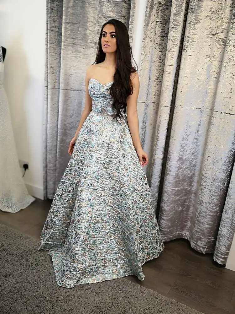 KC19064 is a breathtaking strapless ball gown in a shimmering silver-blue brocade fabric that catches the light beautifully with its iridescent, textured finish. Featuring a sweetheart neckline, a fitted bodice with delicate waist detailing, and a dramatic full A-line skirt, this gown makes an unforgettable statement for your debs night. An in-store exclusive available only at Obsession Showroom.